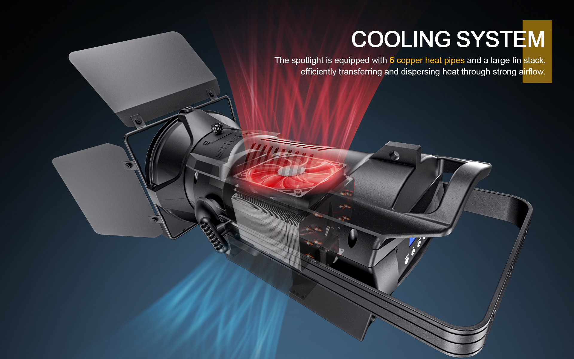 The spotlight is equipped with 6 copper heat pipes and a large fin stack,