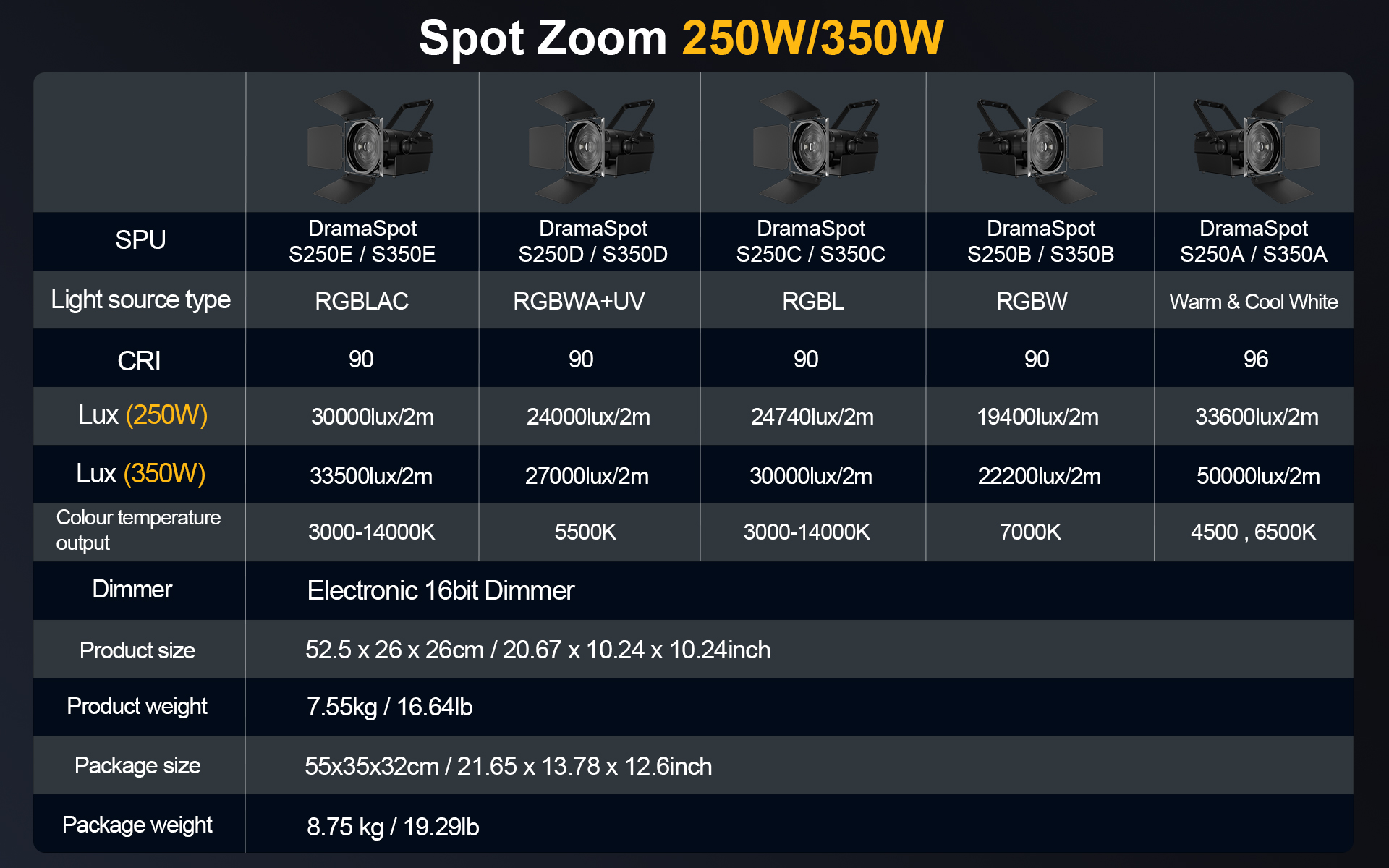 The new Spot Zoom250W/350W Fresnel Zoom Spotlight delivers exceptional performance with cutting-edge color technology.
