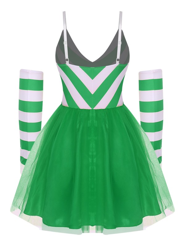 Color-block striped bodice is a trendy element, combined with the Christmas candy cane theme, creating a festive and fashionable look that easily catches people’s eyes.
