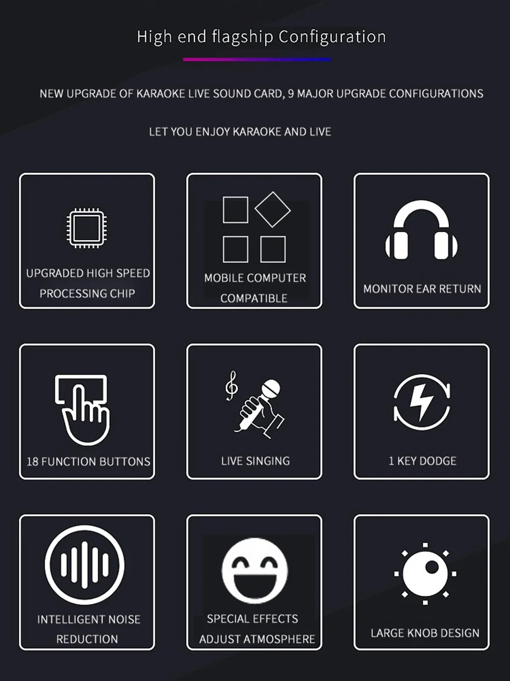 2. Reverberation size adjustment, microphone volume adjustment, high bass adjustment, recording volume control, music volume control, monitoring volume control (earphone function).