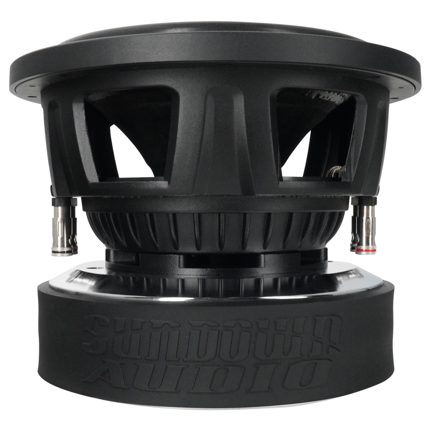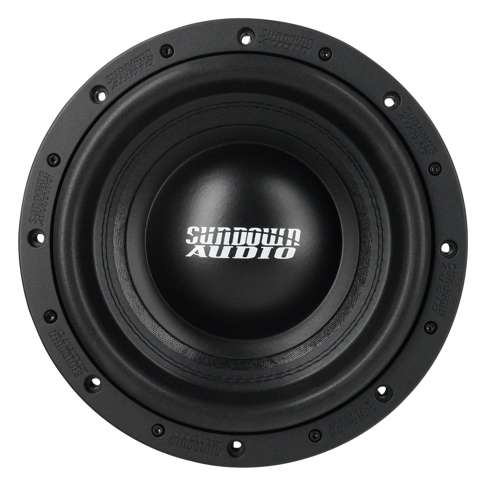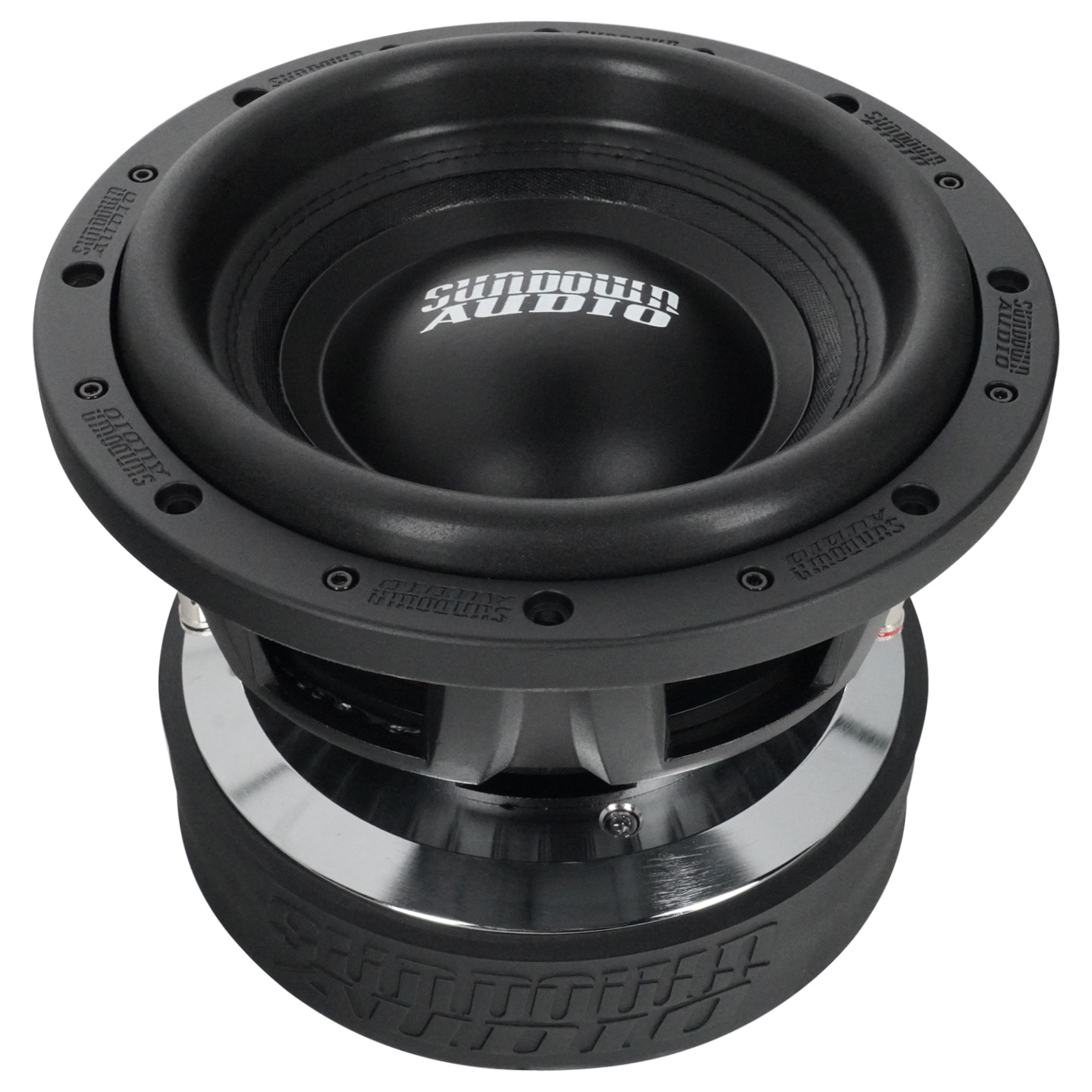 Designed to be at home in the competition lanes or playing your favorite music, the U Series is the premier “standard suspension” woofer in the Sundown lineup. A double-stacked 9.4-inch wide ferrite magnet system is coupled to a thick top plate. A thick set of shorting rings are used inside the magnets and on the pole cap, smoothing out frequency response while doubling as a heat sink and airflow guide. A custom, substantially thicker aluminum frame was designed specifically for the U Series, equipped with heat dissipation ribs. The U v.2 motor also features an extended pole piece to keep the coil under perfect control under high stress. The coil temperature is kept in check via a high-velocity solid pole / machined pole channels arrangement and a series of 16 direct air-gap vents in the back plate.