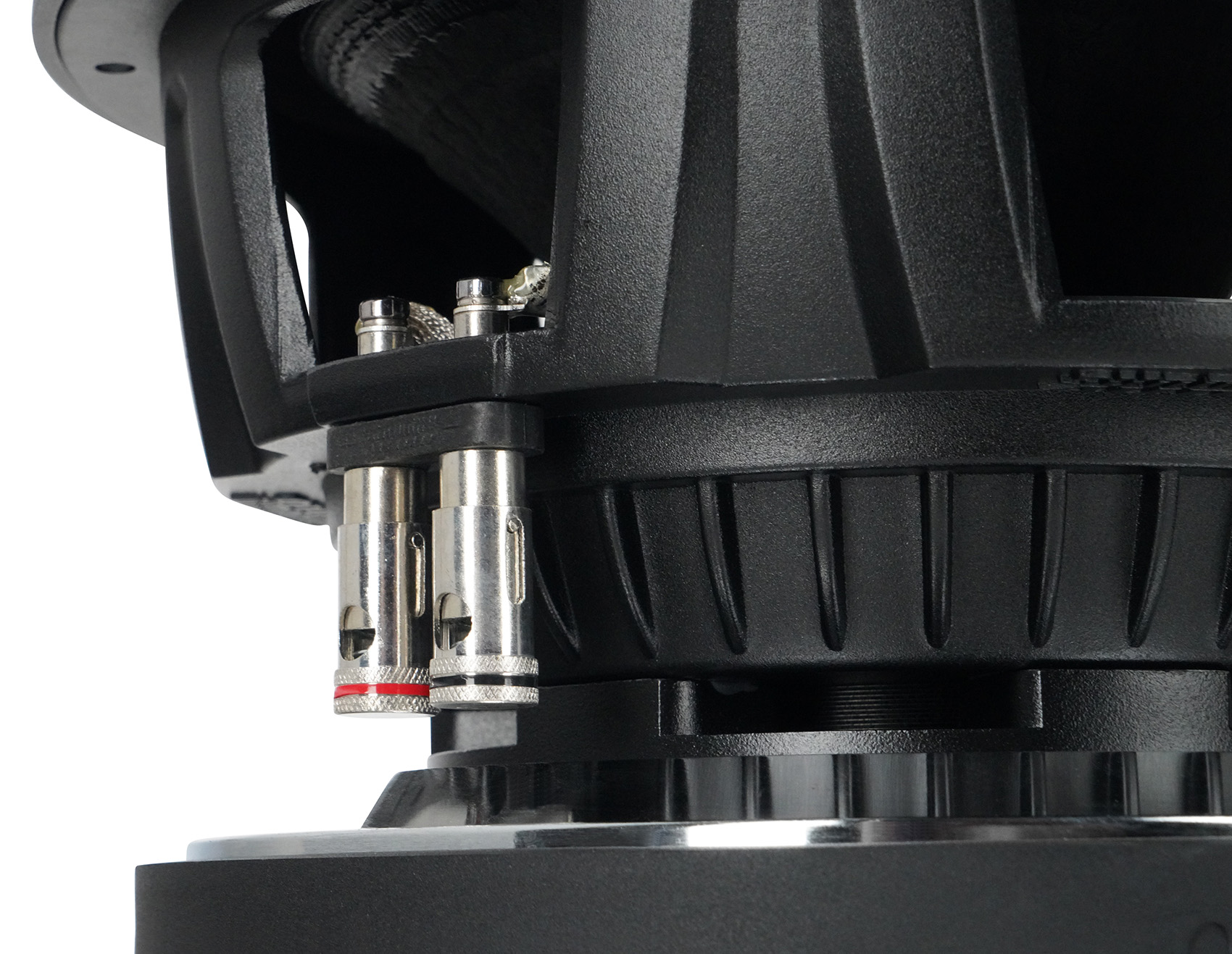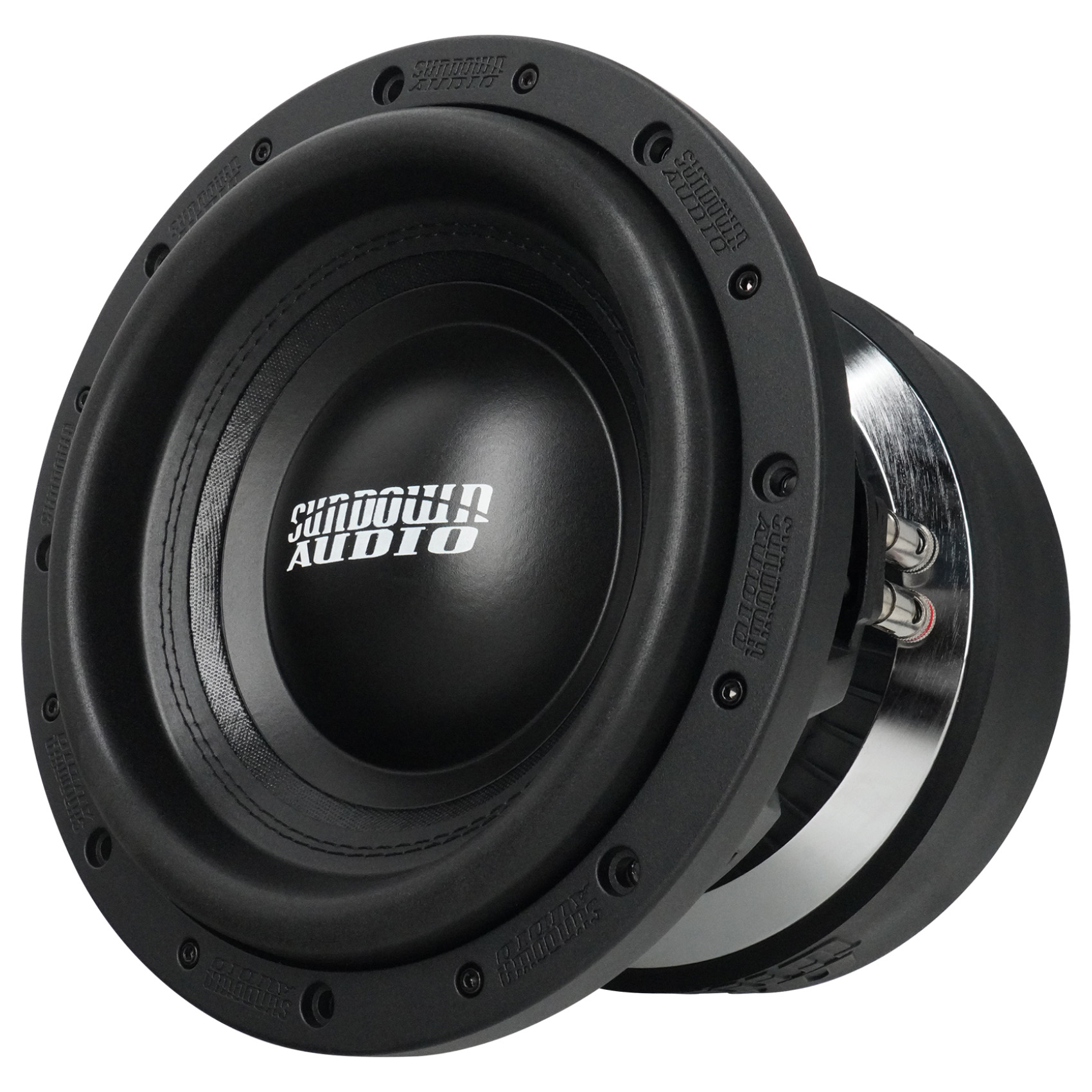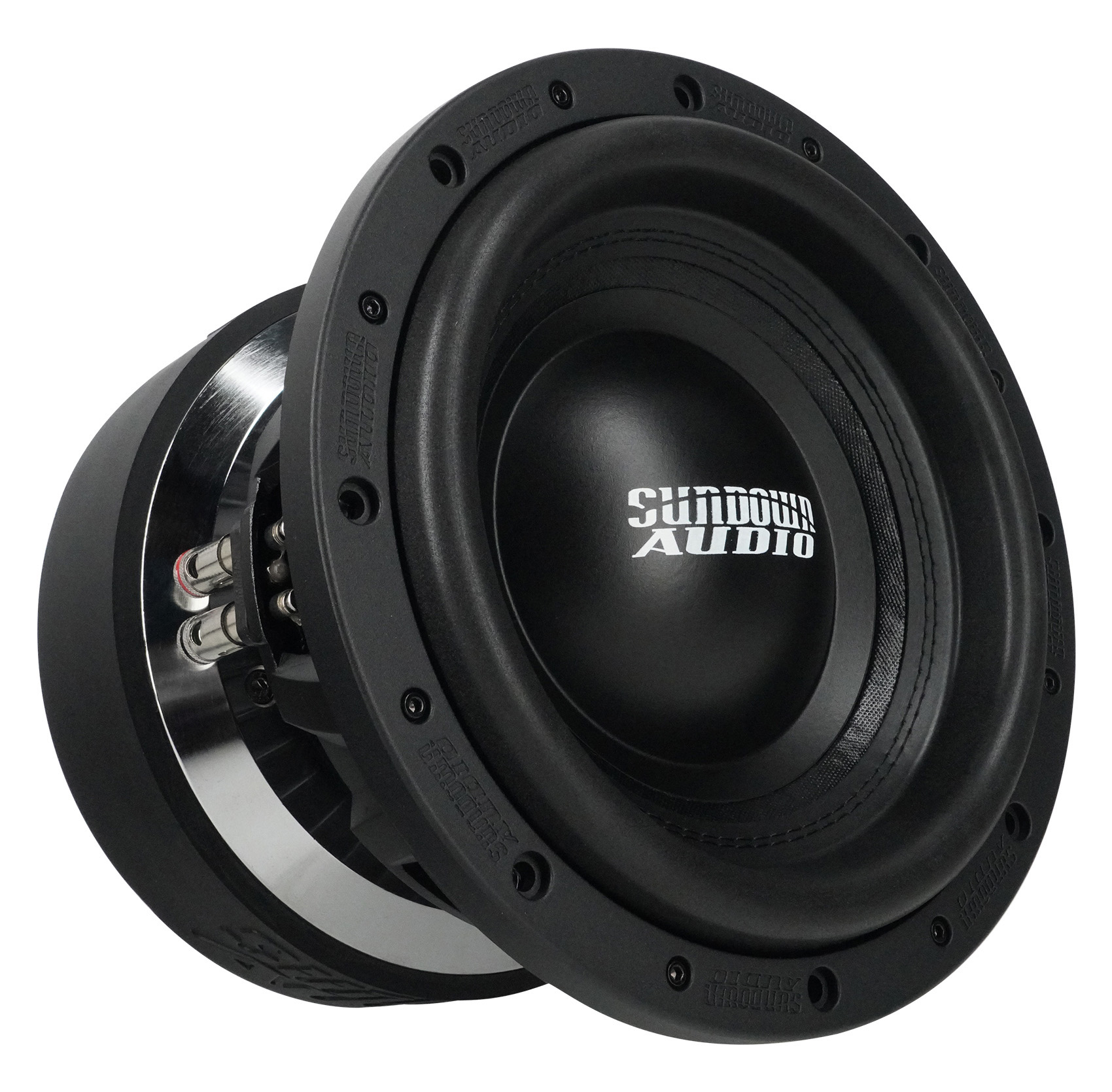 Designed to be at home in the competition lanes or playing your favorite music, the U Series is the premier “standard suspension” woofer in the Sundown lineup. A double-stacked 9.4-inch wide ferrite magnet system is coupled to a thick top plate. A thick set of shorting rings are used inside the magnets and on the pole cap, smoothing out frequency response while doubling as a heat sink and airflow guide. A custom, substantially thicker aluminum frame was designed specifically for the U Series, equipped with heat dissipation ribs. The U v.2 motor also features an extended pole piece to keep the coil under perfect control under high stress. The coil temperature is kept in check via a high-velocity solid pole / machined pole channels arrangement and a series of 16 direct air-gap vents in the back plate.