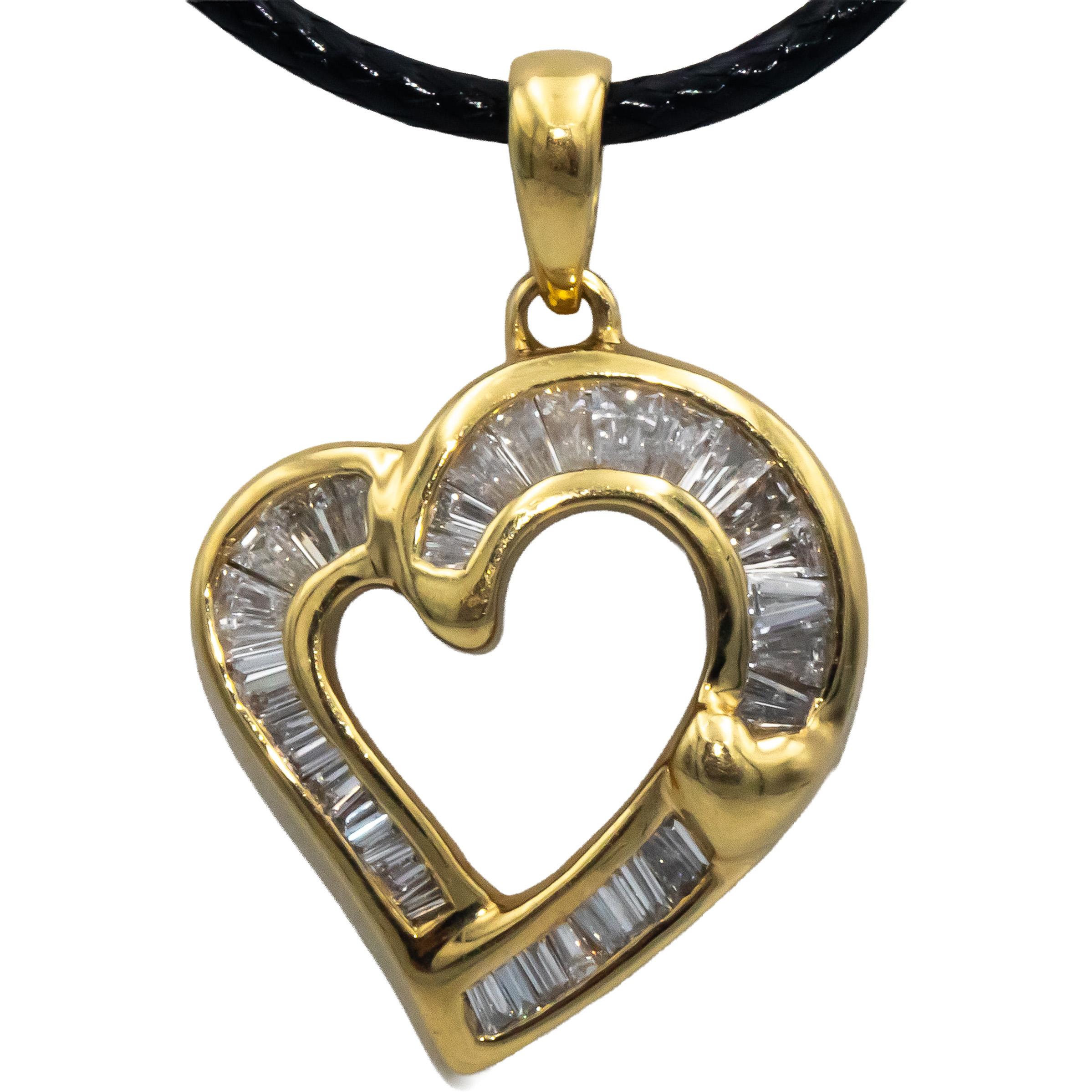 Crafted with precision, the pendant features a heart motif in 18k yellow gold. Adorning the design are baguette-cut diamonds, totaling 1.0 carat (VS2 - SI1 clarity/F - G color), exuding a brilliant white sparkle. The intricate arrangement of stones enhances the pendant's luxurious appeal.