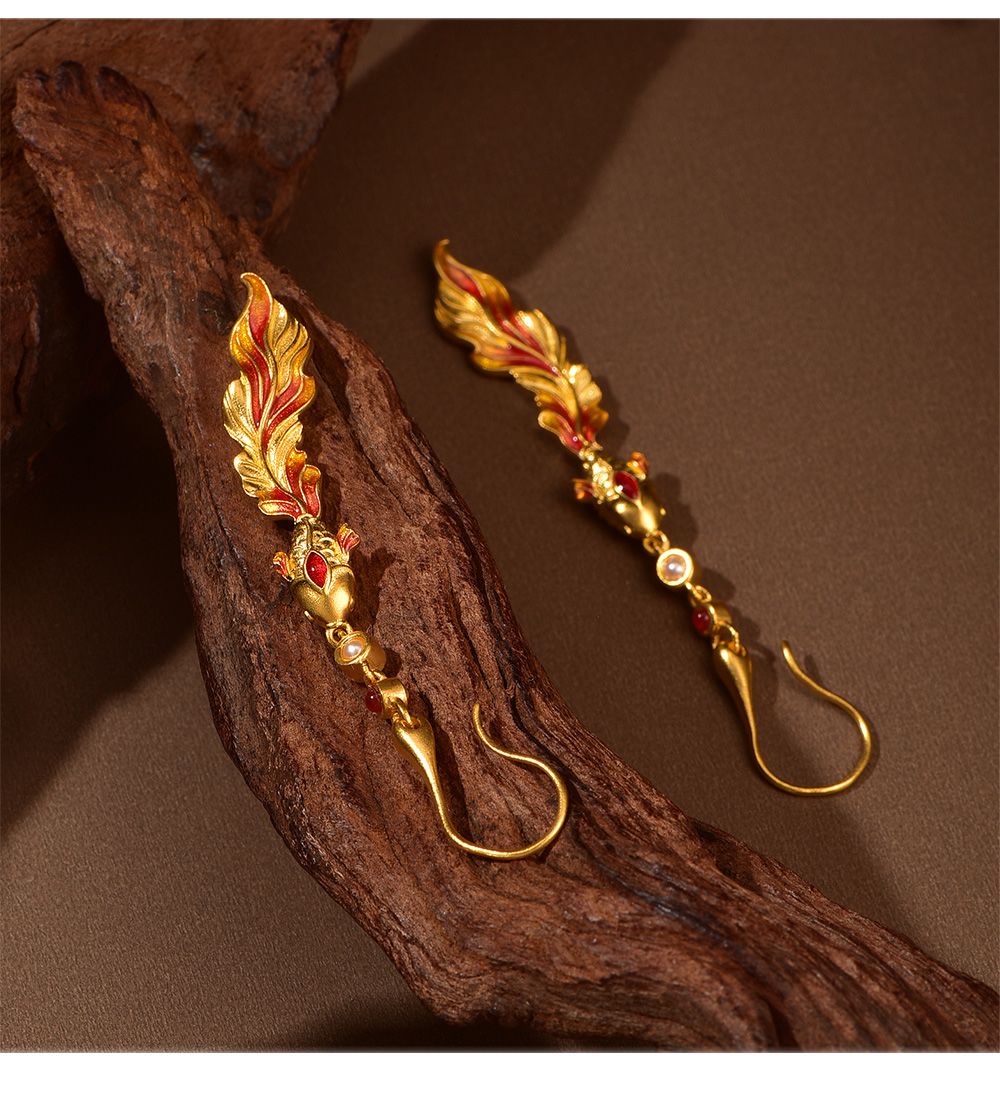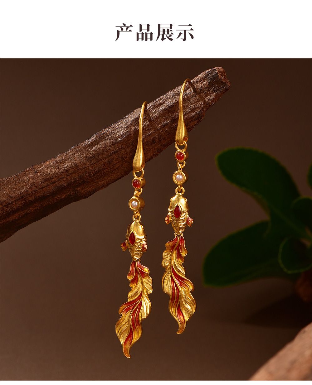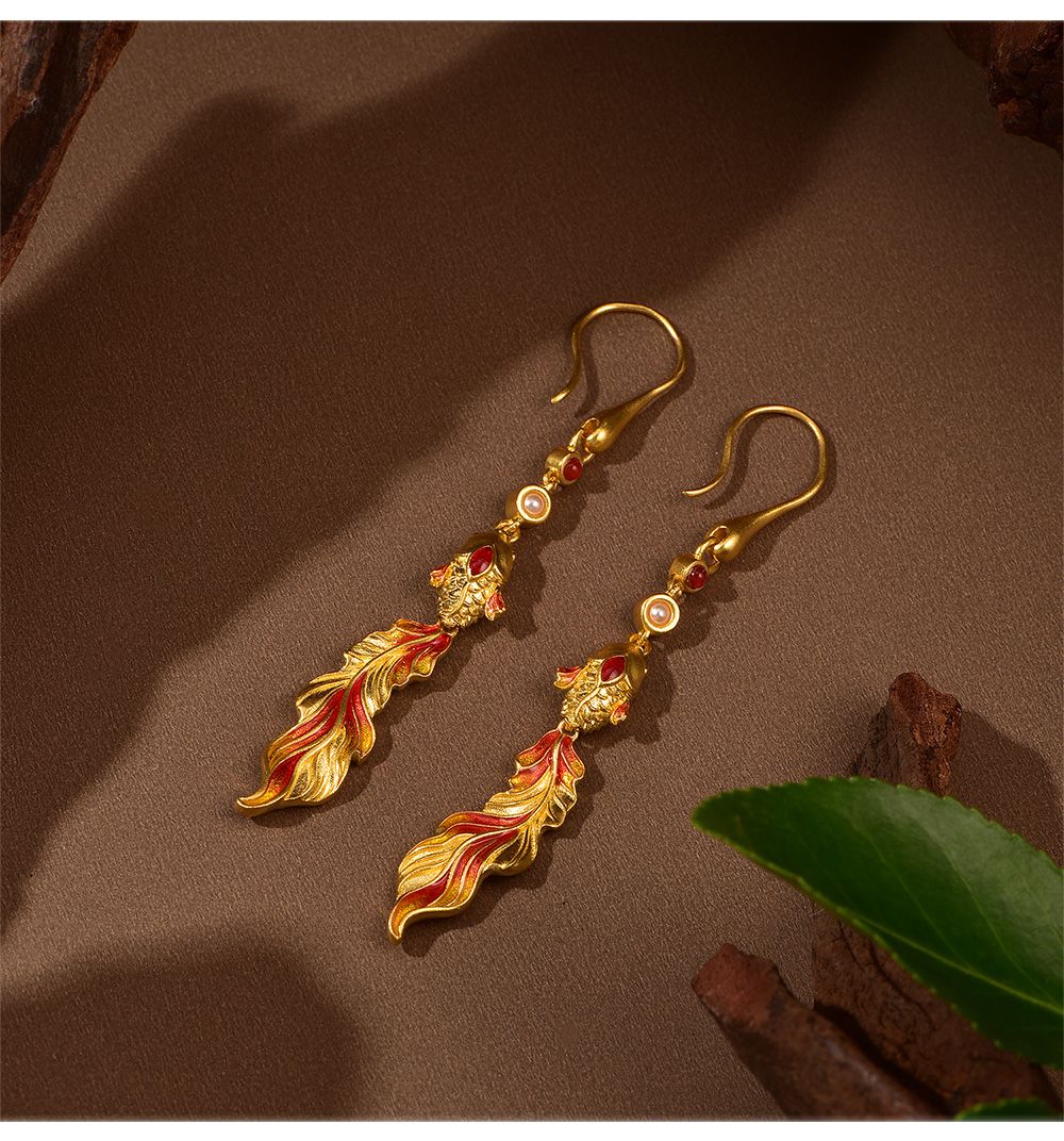 Gold Tone Enamel Koi Fish Tassel Earrings Vintage Chinese Style Jewelry for Women