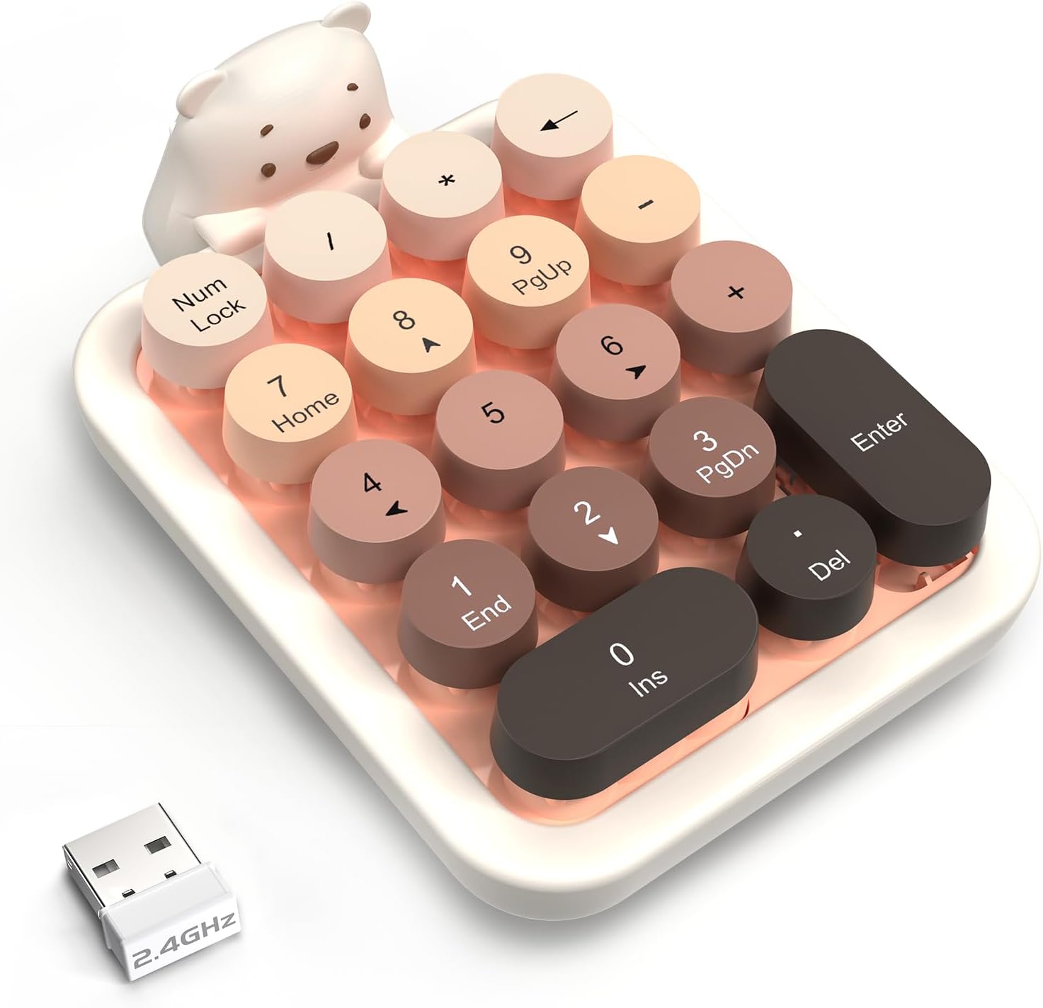 FELiCON Wireless Numeric Keypad, 18-Key Portable Mini Number Pad with Retro Round Key and 2.4G USB Receiver, Removable Cute Bear Silicone Cover for PC, Laptop, Computer, Win, Mac - Milk Tea