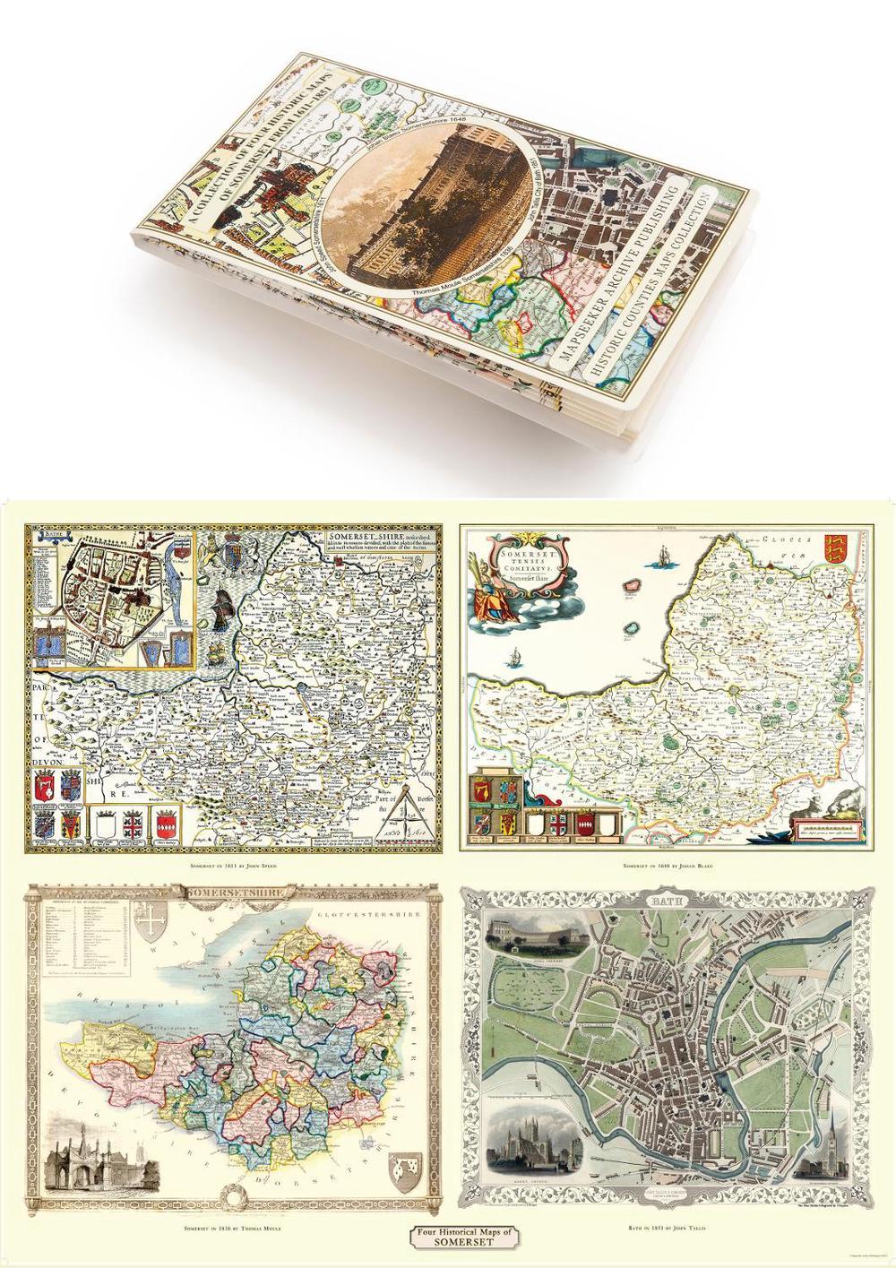 Somersetshire 1611 1836 Fold Up Map that features a collection of Four Historic Maps, John Speeds County Map 1611, Johan Blaeus County Map of 1648, Thomas Moules County Map of 1836 and a Plan of the City of Bath from 1851 by John Tallis. The maps fe