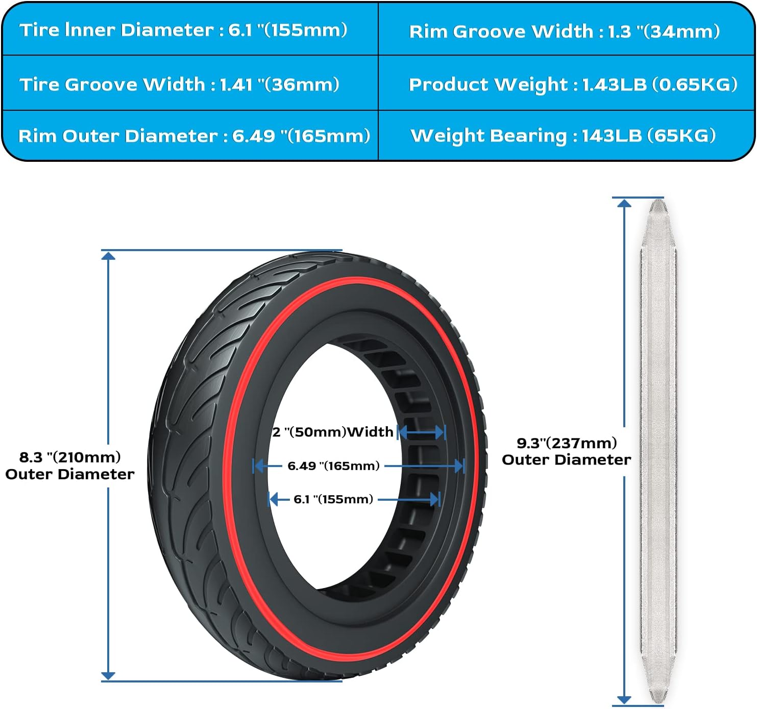 ✅【Erhöhte Reichweite um 25 % im Vergleich zu herkömmlichen Gummireifen】Dieser verbesserte Vollgummireifen hat eine bessere Ausdauer. Nach professionellen Tests durch erhöht sich die Laufleistung des voll aufgeladenen Rollers um 25 % im Vergleich zu herkömmlichen Vollgummireifen. Die Reichweite von andere Reifen sind 28 Kilometer lang, und der Reifen kann 35 km erreichen. 8,25 Zoll Außendurchmesser, 5,5 Zoll Innendurchmesser und 2 Zoll breit.