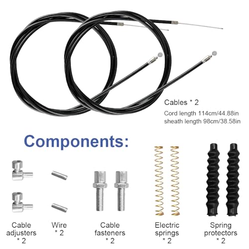 Le kit comprend 2 câbles de frein, 2 gaines de câble, 2 ressorts, 2 gaines de ressort, 2 vis de réglage, 2 attaches de câble et 2 embouts de câble. Longueur du câble de frein environ 114 cm, longueur de la gaine du câble environ 98 cm.