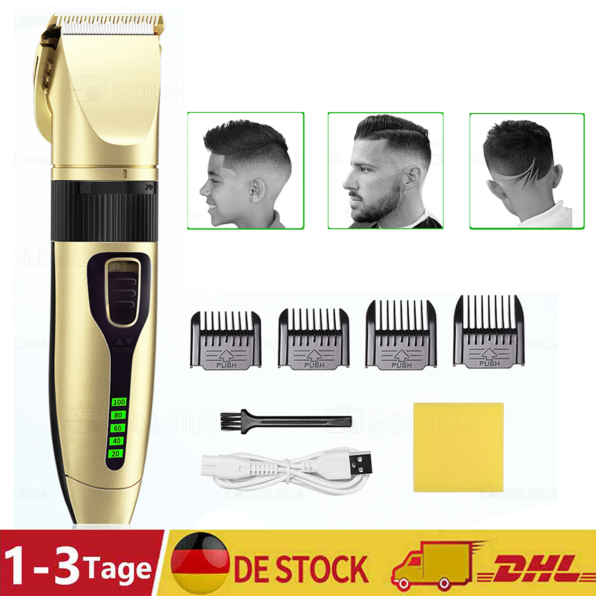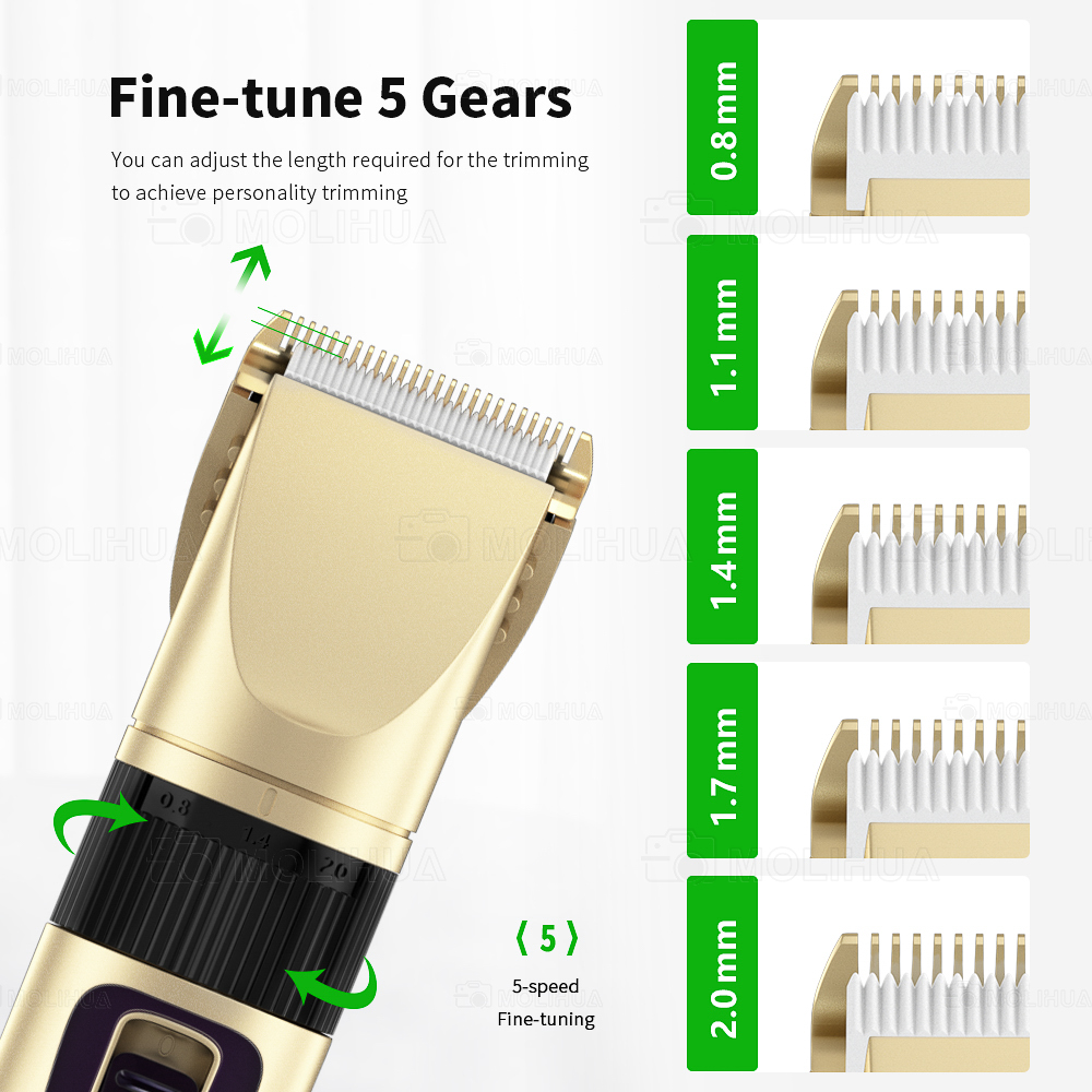 - Fünf Feinabstimmungsstufen und vier Führungskämme. Sie können die Klinge fein einstellen oder den Führungskamm anlegen, um die Haarlänge entsprechend Ihren Anforderungen zu steuern.