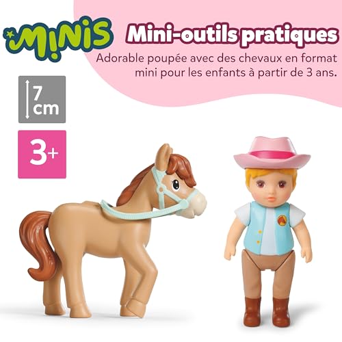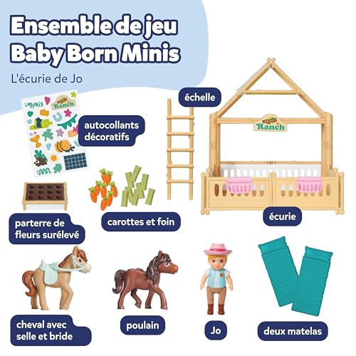 BABY Born Minis Kit de Jeu pour écurie - Poupée Jo avec écurie, 2 Chevaux, Accessoires et Autocollants - Accessoires de poupée de qualité supérieure - Convient aux Enfants à partir de 3 Ans
