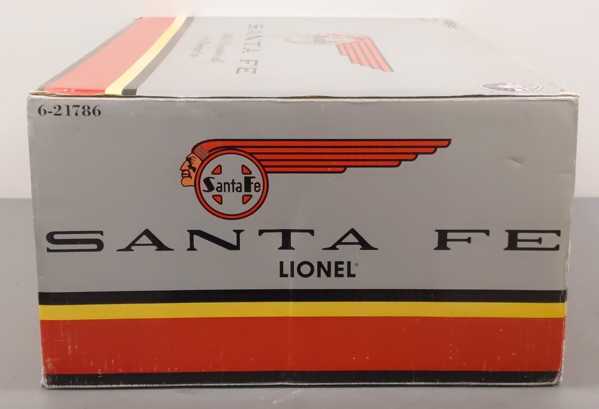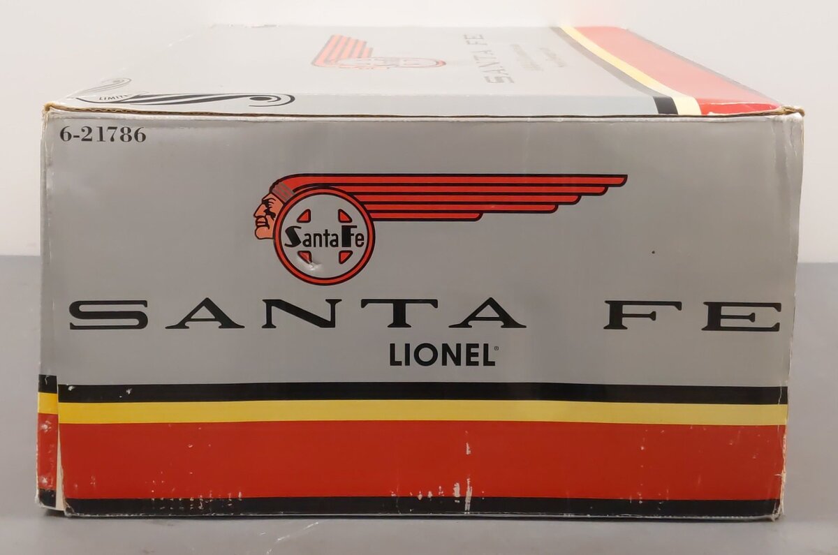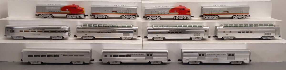 Here is a Lionel 6-21786 O Gauge Santa Fe A-B-B-A F3 Locomotive Unit and 7 car passenger set. This fantastic set features a four unit A-B-B-A Diesel set with Command and Railsounds, and 7 matching aluminum cars. The set includes a F3 Powered A-unit, a RailSounds B-unit, a New powered B-unit, a Dummy A-unit, a Large door Baggage car, a Large door Combo car, 3 full Vista dome cars, and an Observation Car. Features include Command Control, RailSounds with CrewTalk and TowerCom, die-cast trucks, Magne-traction and Pullmor motors, Powered B-unit with dual Pullmor motors, Die-cast frames on B-units, Odyssey System speed control, Large door aluminum Baggage car, Large door aluminum Combo, Overhead lighting system, Real-life interiors with passengers, Diner with StationSounds, and car names and numbers never before used by Lionel . As you can see, nothing has been held back in this great 100th anniversary exclusive.