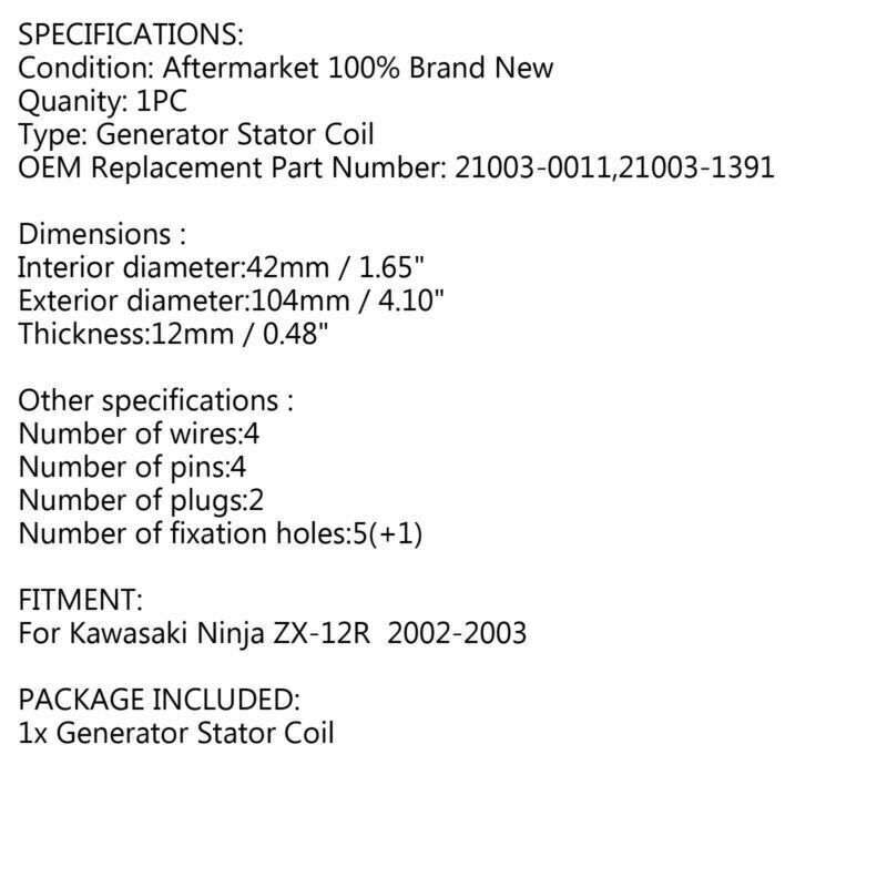 Magneto Generator Engine Stator Coil For Kawasaki Ninja ZX-12R ZX12R ZX 12 R 2002-2003 FEATURES: SPECIFICATIONS: Dimensions : Other specifications : FITMENT: PACKAGE INCLUDED: NOTICE: Check the AC output of the stator. All item pictures are accurate; if in doubt do not hesitate to compare our item to your original part.