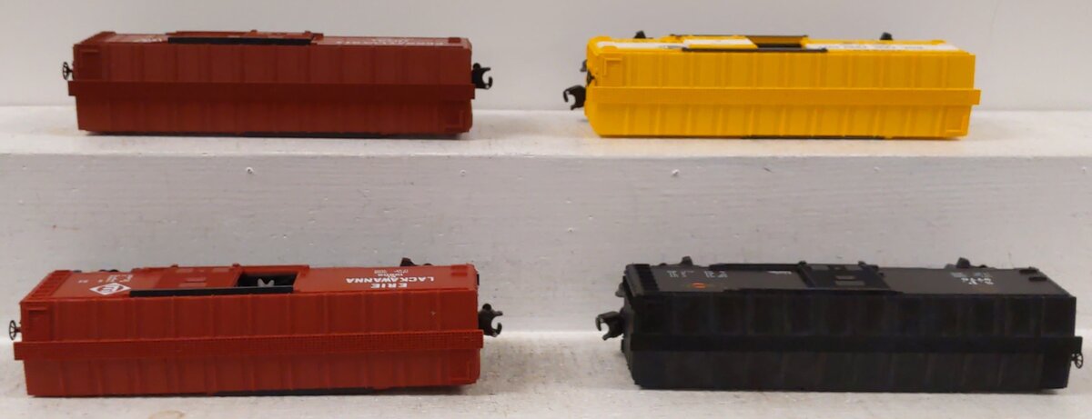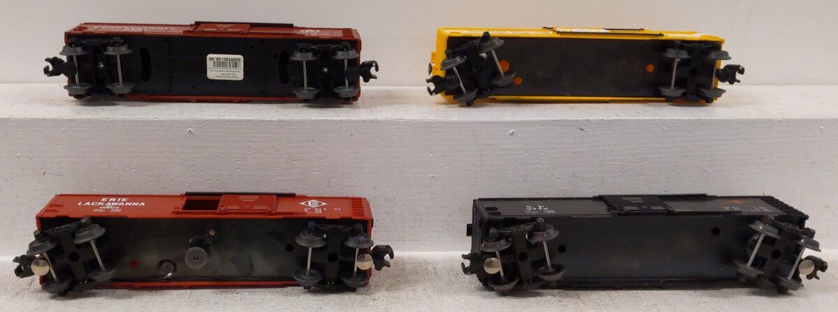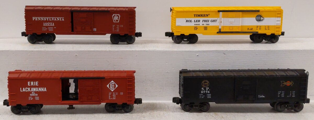 Here are 4 Lionel O Assorted Freight Cars: 19751, 64645, 9776, 19809. These items feature plastic or body construction, plastic trucks, operating knuckle couplers, and metal wheels and axles. Lionel 6-9776 O Gauge Southern Pacific "Overnight" Boxcar, Lionel 6-19809 O Gauge Erie Lackawanna Operating Boxcar, Lionel 6-29212 Timken Roller Freight 64645 Boxcar Train Car, LIONEL 6-25057 O GAUGE PENNSYLVANIA BOXCAR PRR #19751