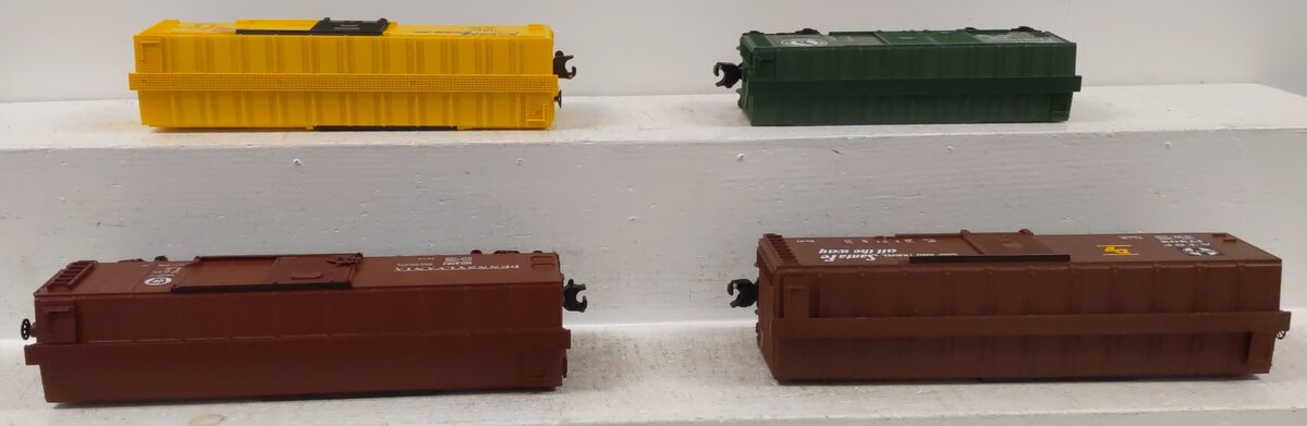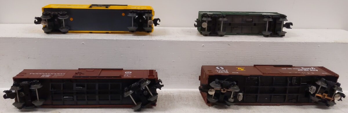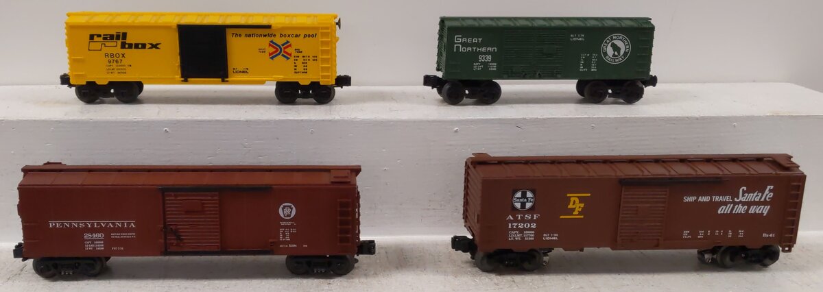 Here are 4 Lionel & Other O Scale Assorted Freight Cars: 28460, 17202, 9767, 9339. These items feature plastic or die-cast body construction, plastic or die-cast trucks, operating knuckle couplers, and metal wheels and axles. Lionel 6-9767 O Gauge Rail Box Boxcar, MTH 30-8401 O Gauge Pennsylvania Diecast Boxcar #28460, Lionel 6-9339 O Gauge Great Northern Boxcar, Lionel 6-17202 O Gauge Santa Fe Rail sounds Boxcar
