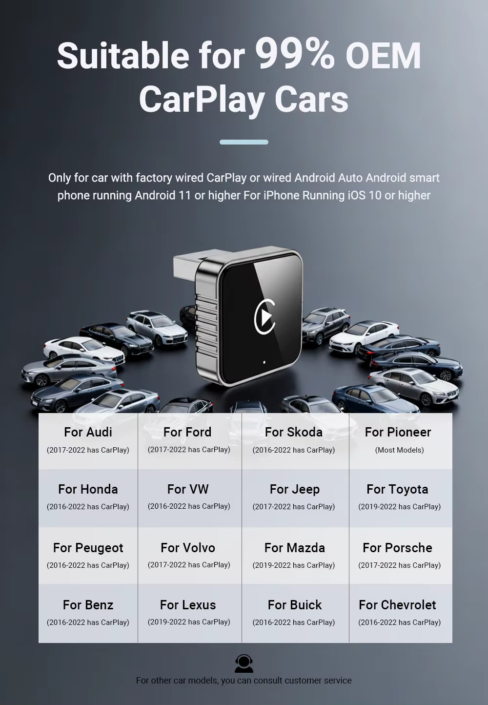 Transform your factory-wired CarPlay or Android Auto system into a fully wireless experience with this 2-in-1 mini adapter. Designed for 99% of OEM vehicles equipped with wired CarPlay, this compact device lets you enjoy the freedom of wireless connectivity while retaining all your original car controls and features.