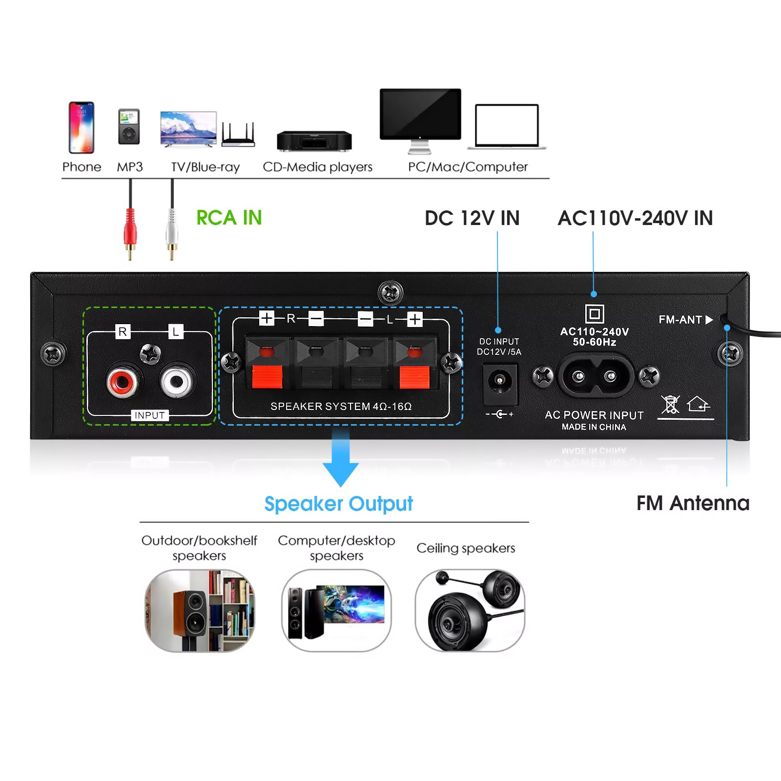 Features: Multiple audio inputs: besides Bluetooth5.0/stereo RCA/3.5mm AUX inputs, that can be compatible with ipad, cellphone, MP3 player, CD player, dataplay, computer, decoder, etc. Also with USB(U-disk)/TF Card/FM radio inputs, can be used as a music player and a radio, easy to enjoy high-qaulity music at home or on the road. Rated 30W+30W output power: supporst speakers with 4-16 ohm impedance, has a good match with most home & car & boat speakers, can give your entertainment system a boost, with unrivaled sound superiority and lets you enjoy high quality amplified audio. AC110-240V / DC 12V working voltage suit many places: beside used in home desktop audio system, it also can be used in your car, your boat, your RV, your golf cart— anywhere you need a great amplifier with low distortion and acoustically accurate reproduction of music. Perfect design with powerful function: with volume knob, treble and bass control, easy to get more delicate sound. Designed LED display to clearly show the working status in real time, and euipped with remote control, much easier to use, very suitable for indoor and outdoor audio system use.