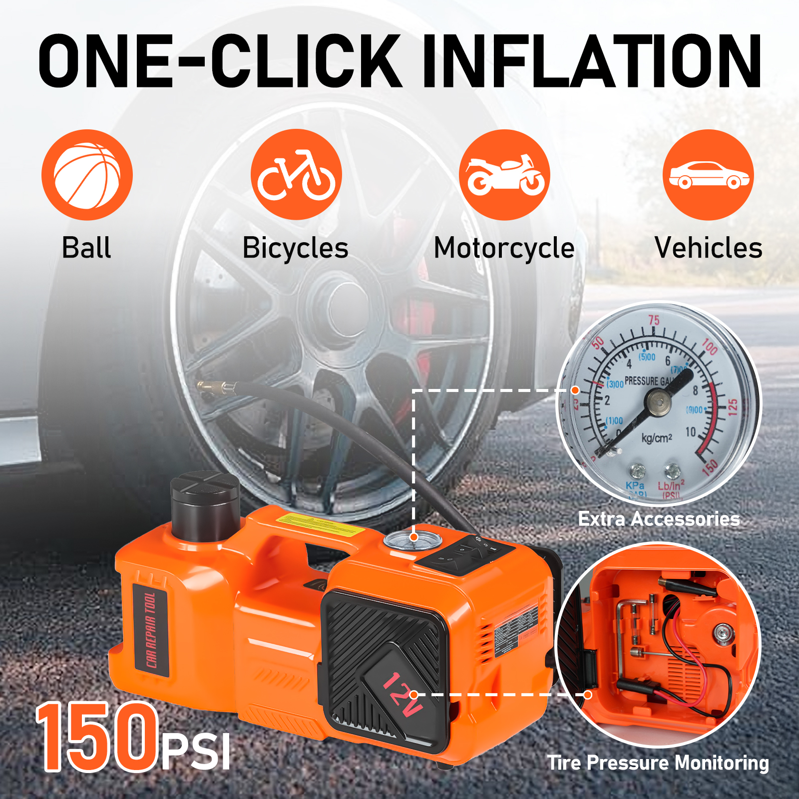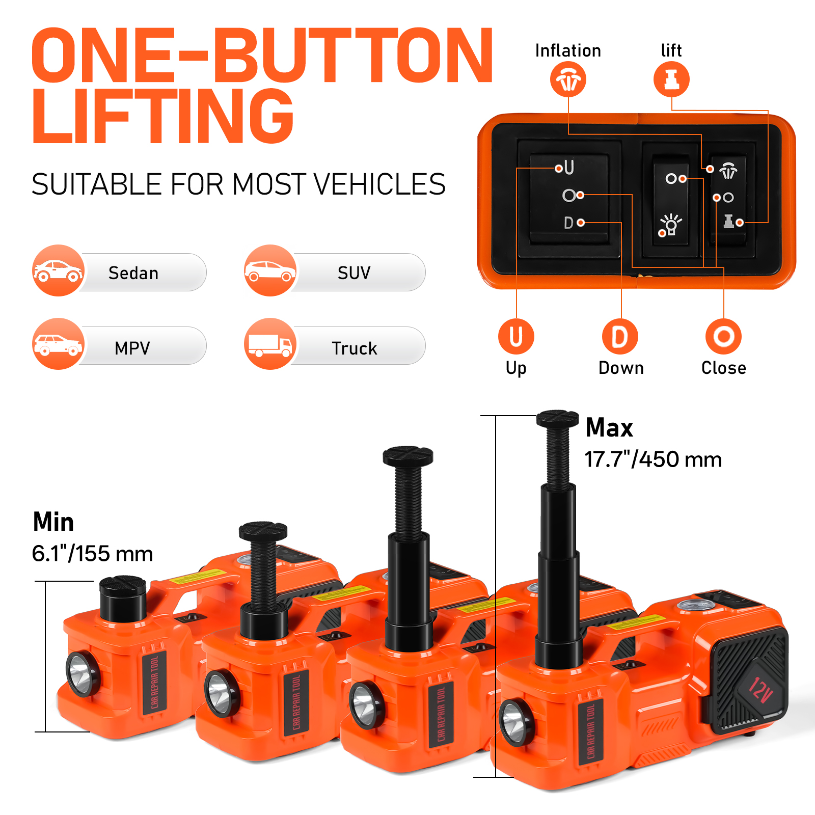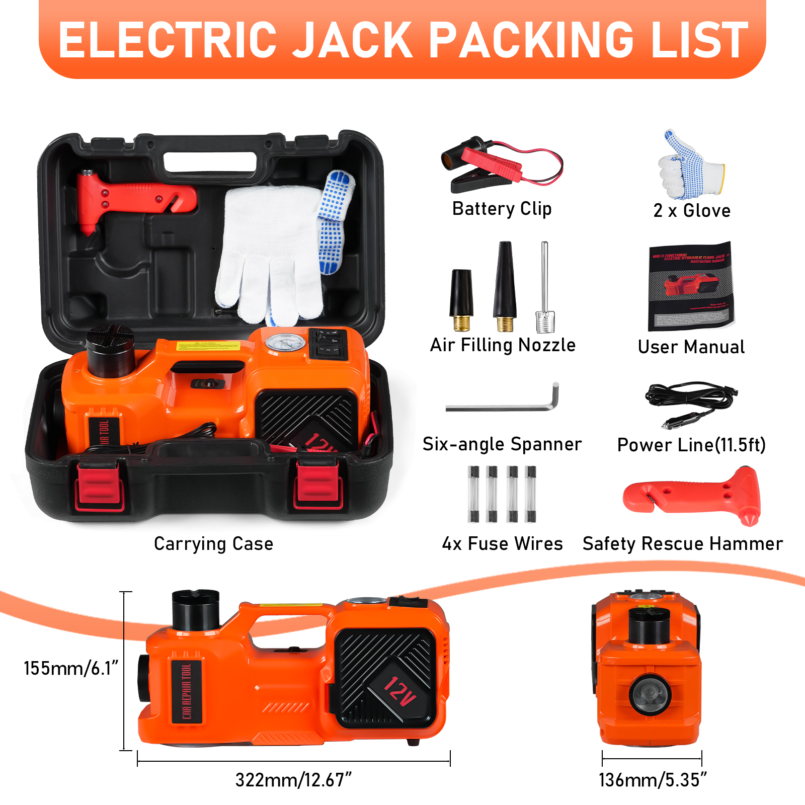 More Than 1 Way to Charge: The electric hydraulic jack for your vehicle can be powered by a 12V cigarette lighter or car battery and equipped with a long 13 feet power cord so you can place it by the front or rear tire without having to think twice. We also provide you with three spare fuses, and our fuses are TUV, and UL-certified, so you can use them confidently!