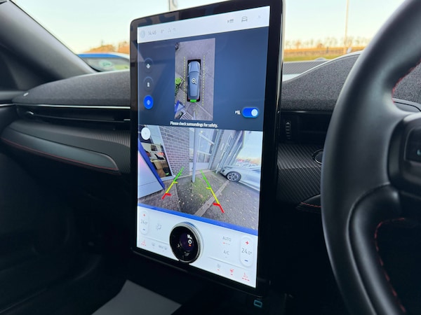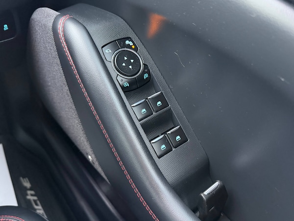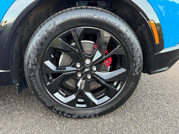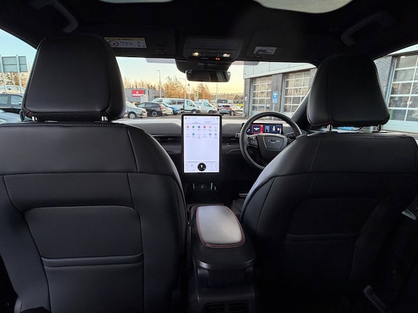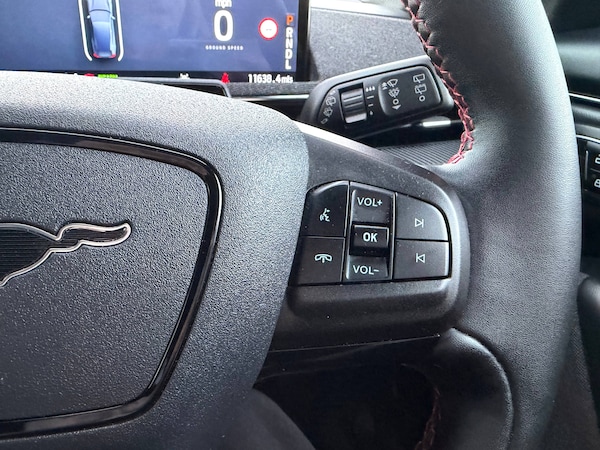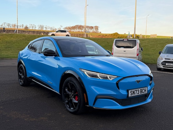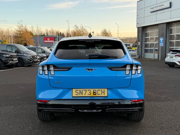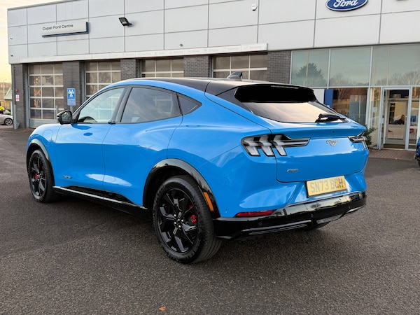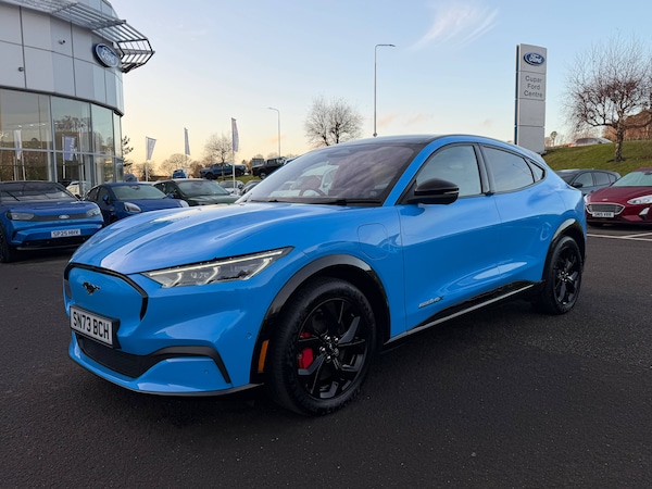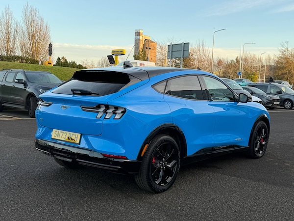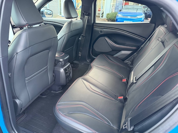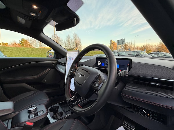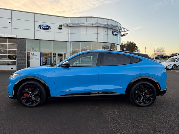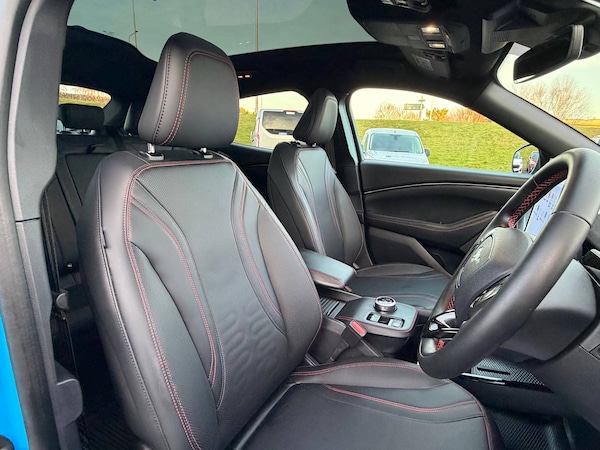 3 point rear seatbelts, ABS, Child locks on rear doors, ESP, Evasive steering assist, Pre collision assist with Forward Collision Warning (FCW), Dynamic Brake Support (DBS), Autonomous Emergency Braking (AEB), Red brake callipers, 10.2 inch full digital cluster and 15.5 inch central touch screen, 360 degree view camera, Applink remote control system, BLIS (Blind Spot Information System) with cross traffic alert, Distance alert and indication system, Electric power steering, Emergency services call system, Ford pass connect embedded modem, Front and rear parking sensors, Hands free tailgate, Intelligent adaptive cruise control with stop and go + lane centering, Lane departure warning with lane keeping aid, Next generation SYNC with connected navigation+DAB and natural voice search, Selectable drive modes - active, whisper and untamed, Trip computer, Wireless device charging pad, 3rd brake light, Adaptive LED Mustang signature headllamps, Black power folding door mirrors with Mustang logo projection puddle lamps, Blade front grille design, Body colour bumpers, Daytime running lights, Fixed full panoramic roof, LED signature tail lights, Privacy glass, Quickclear heated windscreen, Rear side wing doors, Rear wiper, Side cladding and wheel arches in piano black, Solid paint, 3 seat bench in 2nd row, 8 way power driver and passenger seats with lumbar - fore/aft/up/down/recline, Ambient lighting, Dual zone electronic air temperature control, Front headrests, Front trunk, Heated driver and front passenger seats, Heated steering wheel, One pedal drive, Perforated full sensico artificial leather upholstery, Rear head restraints, Single front passenger seat, 11 kW AC onboard charger, Ford vario power charging cable, High power charging cable, E-Latch keyless entry system including B-Pillar keypad access, Thatcham Cat.1 alarm, B and O premium sound system 10 speaker including dashboard sound bar, 19 inch Black machined alloy wheels