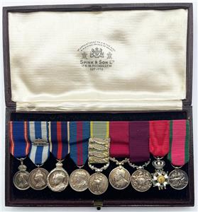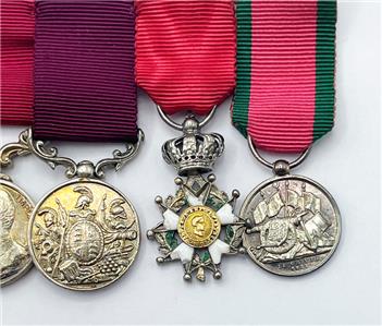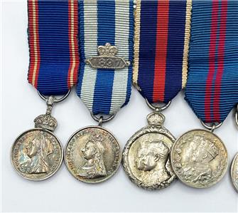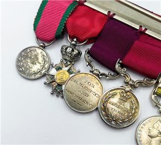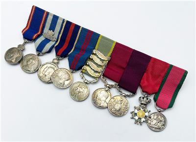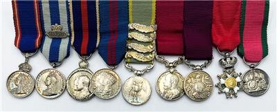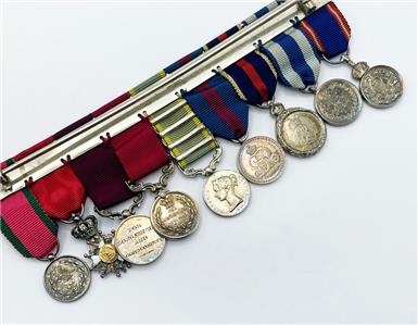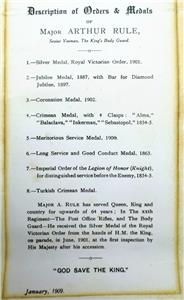 Major Arthur Rule's original miniature medal group in Spink fitted case. Nine medals including Crimea with four clasps, Royal Victorian Order, 1887 Jubilee Medal with 1897 clasp, Coronation medals 1902 & 1911, Meritorious Service Medal, Long Service Medal, Imperial Order of the Legion of Honor, Turkish Crimea Medal. Original cabinet portrait photograph of Arthur Rule is included with the medals. Also included is an old photocopy of his list of awards.