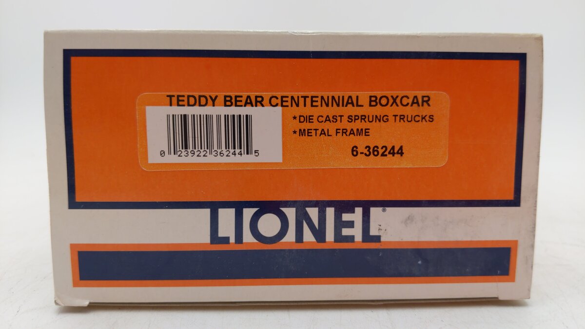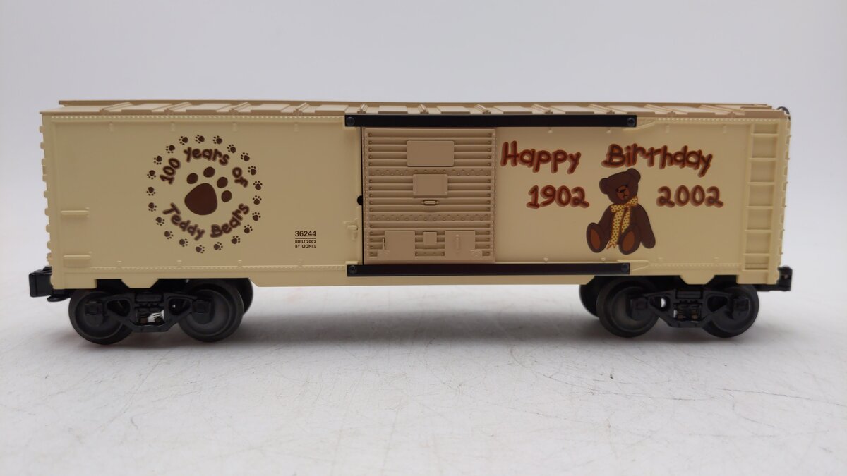 Here is a Lionel 6-36244 O Gauge Teddy Bear Centennial Boxcar from 2002. This car features sliding doors, die-cast metal sprung trucks, die-cast metal operating knuckle couplers, and metal wheels and axles.