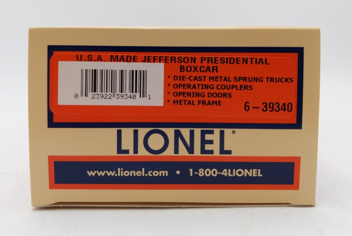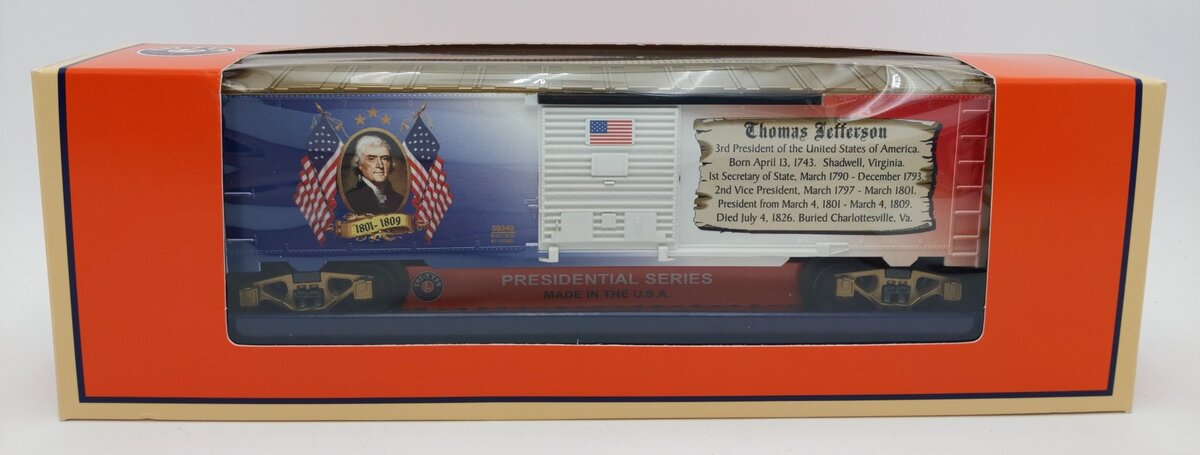 This is a Lionel 6-39340 O Gauge U.S. Made Thomas Jefferson Presidential Boxcar. Lionel reintroduces “Made in the USA boxcars with the U.S. Presidential Box Car Series.