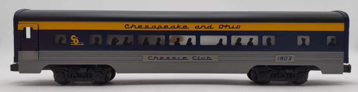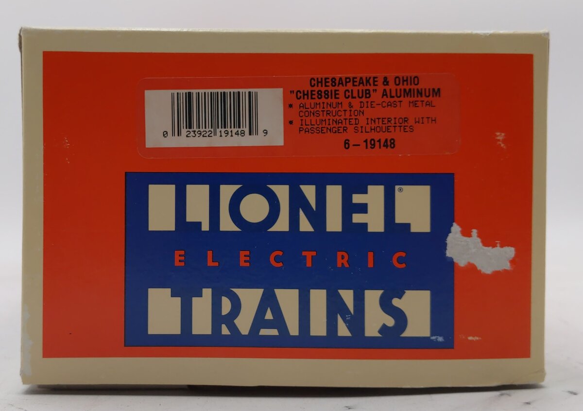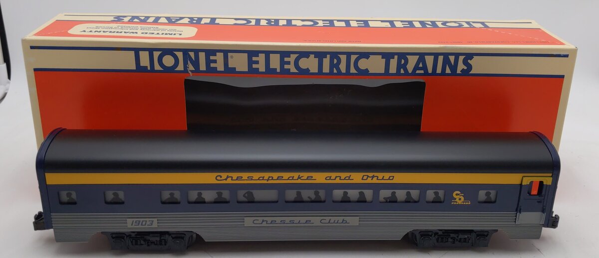 Here is a Lionel 6-19148 O Chesapeake & Ohio Aluminum "Chessie Club" Passenger Car #1903 from 1996. It features die-cast trucks with operating couplers, an illuminated interior with passenger silhouetted windows, and metal wheels. It measures approximately 15" inches in length. Please see my pictures for additional features.