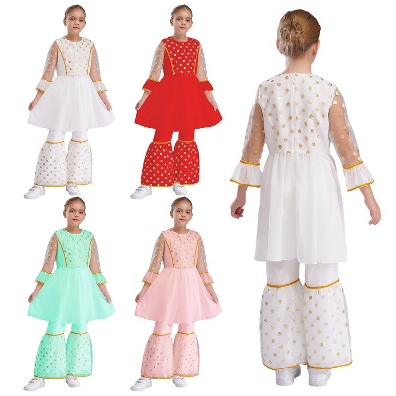 Girl’s round neck flared sleeves dress with an invisible zipper on the back for easy wearing and taking off.
