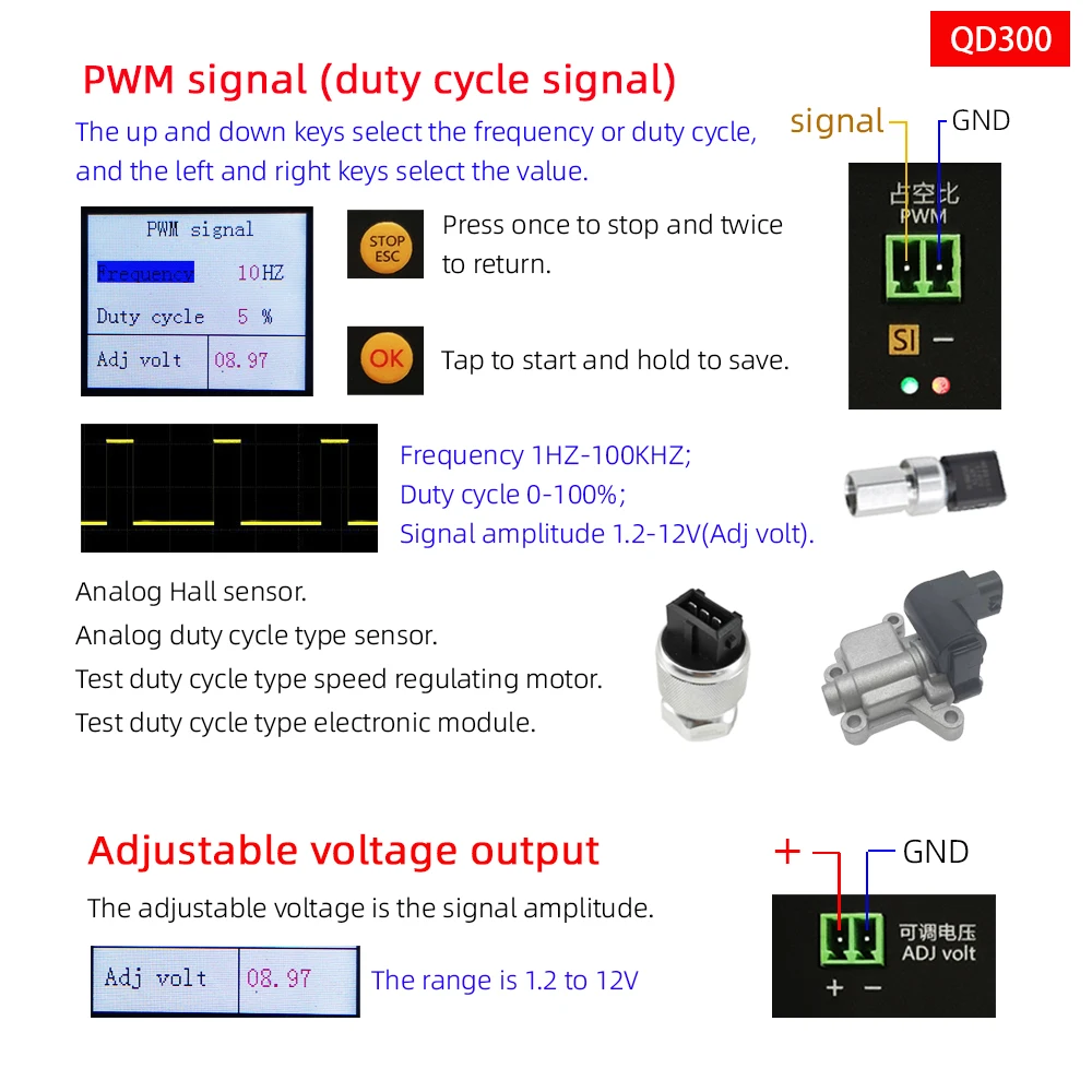 8. Output PWM signal, frequency, amplitude, duty cycle adjustable hall signal, simulate various types of duty cycle type sensors: air conditioning pressure sensor (duty cycle type), air flowing meter (duty cycle type), etc.