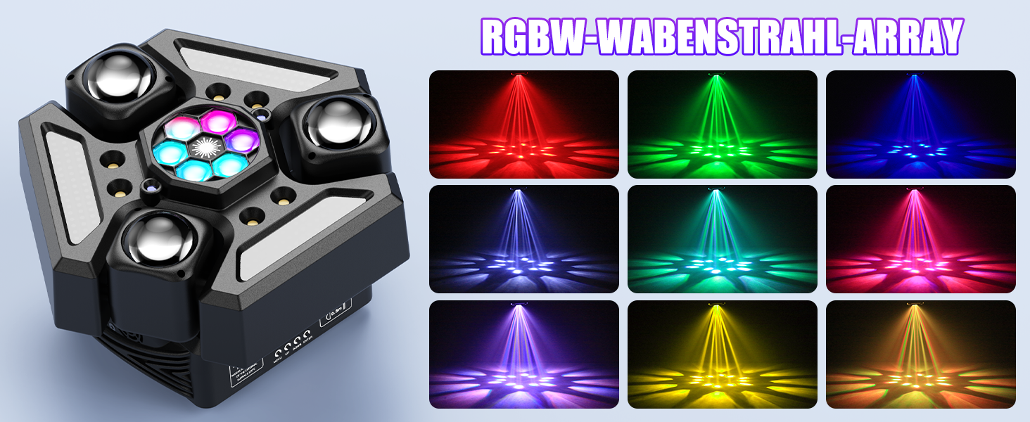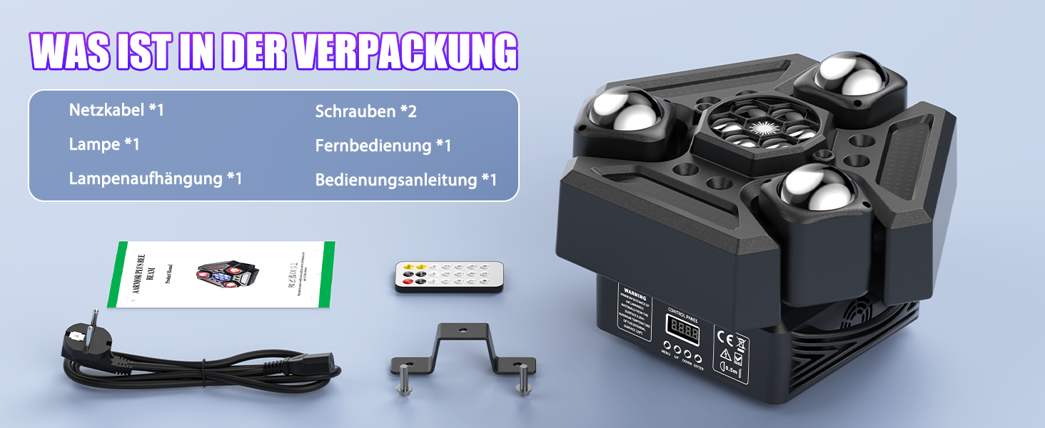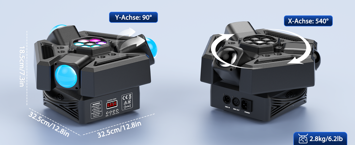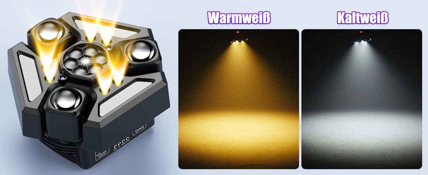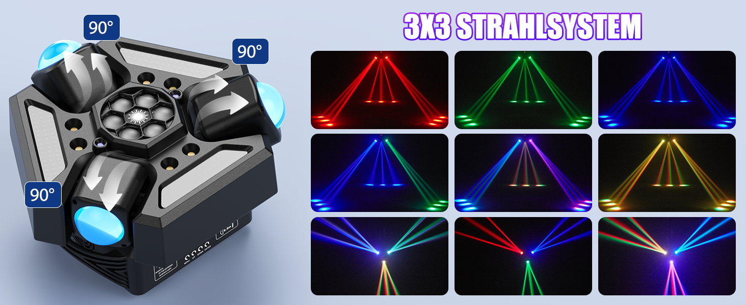 Drei unabhängige Köpfe projizieren 9 beeindruckende Lichtstrahlen mit XY-Achsen-Flexibilität, Dual-Strobe (Warm-/Kaltweiß) und sofortige Party-Energy für kleine Veranstaltungsflächen.