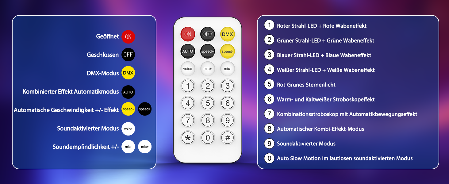 Automatik, Sprachsteuerung, Master-Slave, DMX, Fernbedienung