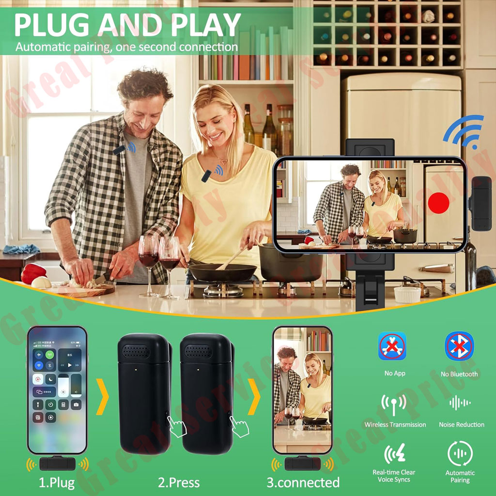 【2 Transmitters & 1 Receiver】This dual smart wireless lavalier microphone includes 2 transmitters and 1 receiver, not only can use a single microphone , but also allowing two sound sources recording during the live stream. It is very easy to use, just clip the wireless mic on your collar and plug the receiver into your phone, they will automatically connect quickly. No need APP or Bluetooth, just plug and play directly