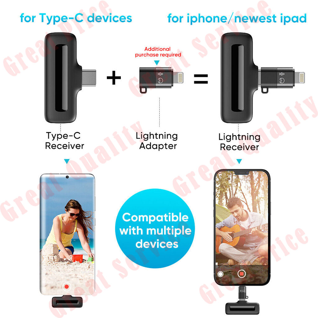 【USB C & Lightning Adaptor, Full Compatibility】Give you Type-c connector and lightning adaptor, the wireless microphone system can apply various devices: for Apple devices and Android devices. Compatible with iPhone series, iPad series, Samsung Galaxy series, Android phones tablets series, and other device with typec or lightning port. Additionally, the mic system can be directly used with any gimbal stabilizer without any adjustment.