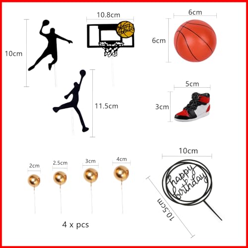 🏀 11 décorations de ballons de gâteau de basket – ball: 1 décoration de basket – ball en vinyle (6cmx6cm), 1 paire de chaussures (5cmx3cm), un grand drapeau de voeux d’anniversaire (10cmx10.5cm), 4 ballons dorés (2cm / 2.5cm / 3cm / 4cm), 11 décorations de bord de basket – ball (10cm x10cm), 2 décorations de figurines d’action (10cm / 115cm), allons – y! Utilisez – les pour décorer la Fête de basket de votre enfant!
