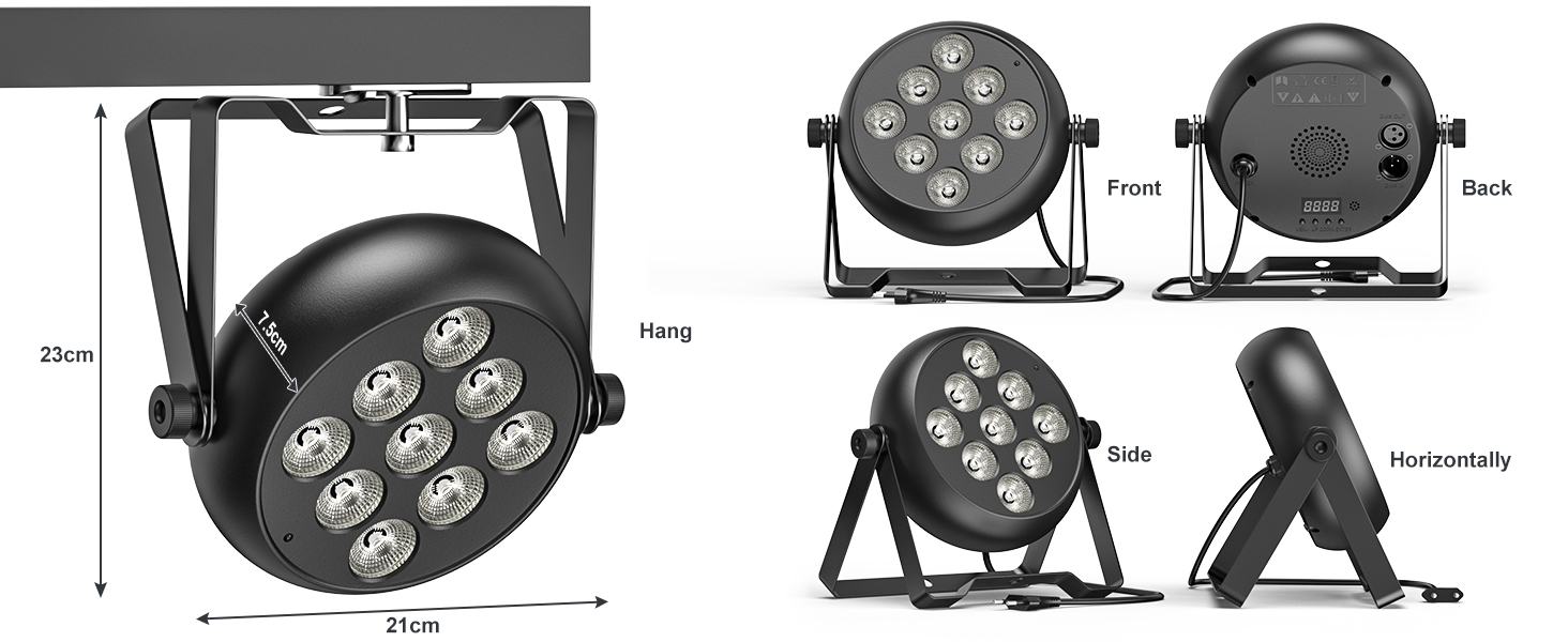 1. 9 Stück 10 W RGBW Lichtquelle für unendliche Farbmischung und Regenbogeneffekte. Das integrierte Programm kann über die Konsole gesteuert werden, 0-100 % lineares Dimmen und Lichtblockierfunktion. 2. Ausgestattet mit einer Fernbedienung können Sie damit ganz einfach den Lichteffekt und den Arbeitsmodus einstellen. 3. Das Aussehen der Lampe ist klein und schön, leicht und tragbar, mit ausgezeichneter Wärmeableitung und langer Lebensdauer. 4. Weit verbreitet bei verschiedenen Anlässen wie Disco, Nachtclub, Party, Hochzeit, KTV, PARTY, dekorativen Heimlichtern usw., um die romantische Atmosphäre zu erhöhen. 5. Dieses Par-Licht wird mit 2 Halterungen und Schrauben für eine einfache Installation an einer Traverse oder an einer Wand oder einfach auf dem Boden geliefert. Der Beleuchtungswinkel des Lichts kann eingestellt werden, was für verschiedene Anlässe sehr gut geeignet ist.