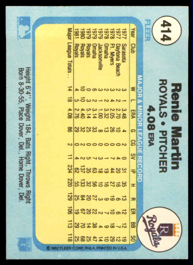 | Description: | Renie Martin | | Category: | Baseball | | Year: | 1982 | | Product: | Fleer | | Team: | Kansas City Royals | | Card Number: | 414 | | Dimensions: | 3½" x 2½" |