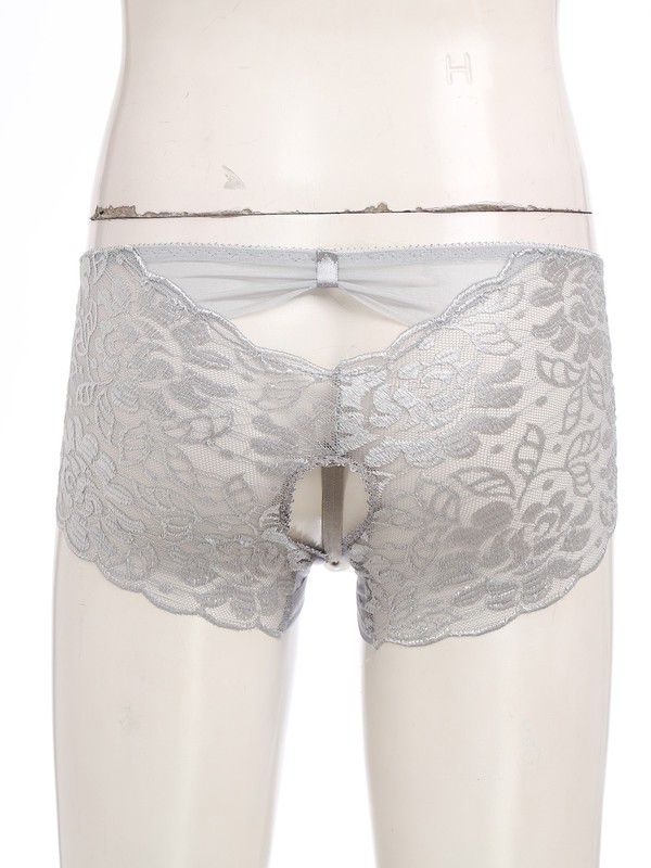 Front with see-through lace design, open butt and minimal coverage.