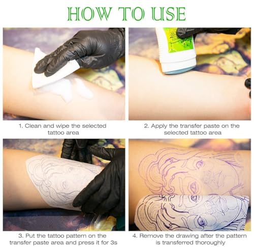 Large gamme d’applications : notre gel crème de transfert de tatouage est adaptée pour une utilisation avec du papier transfert, et peut être appliquée directement et uniformément sur la peau. Il est parfait pour créer des tatouages magnifiques et réalistes sur différentes parties du corps.