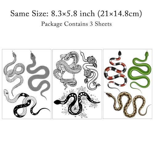 【Paquet】3 feuilles de tatouage temporaire de serpent 3D réaliste (5,8 pouces * 8,3 pouces).