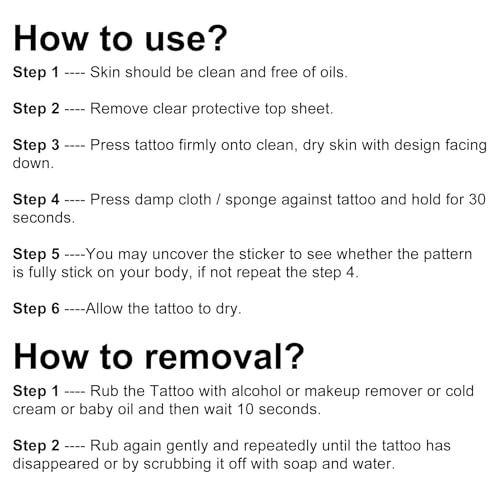 Étape 1 : La peau doit être propre et exempte d’huiles. Étape 2. Retirez la feuille de protection transparente. Étape 3. Appuyez fermement sur le tatouage sur une peau propre et sèche, le motif vers le bas. Étape 4. Appuyez sur un chiffon humide/une éponge contre le tatouage et maintenez pendant 30 secondes. Étape 5 : Vous pouvez retirer l’autocollant pour voir si le motif est entièrement collé sur votre corps, sinon répétez l’étape 4. Étape 6. Laissez sécher le tatouage. Comment retirer le film ? Étape 1 : Frottez le tatouage avec de l’eau, du démaquillant, de la crème froide ou de l’huile pour bébé, puis attendez 10 secondes. Étape 2. Frottez doucement et à plusieurs reprises jusqu’à ce que le tatouage ait disparu ou frottez-le avec de l’eau et du savon.