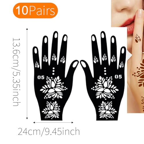 Ensemble complet : le colis comprend 10 différents pochoirs de tatouage au henné réutilisables avec des motifs floraux complexes et traditionnels mehndi pour les mains