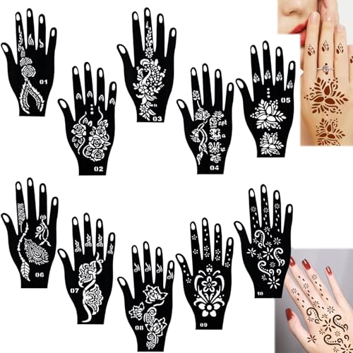 Lot de 10 pochoirs de tatouage temporaire réutilisables pour adultes - Pochoirs de peinture pour art corporel - Modèles de peinture pour la main Mehndi, fêtes, festivals et célébrations