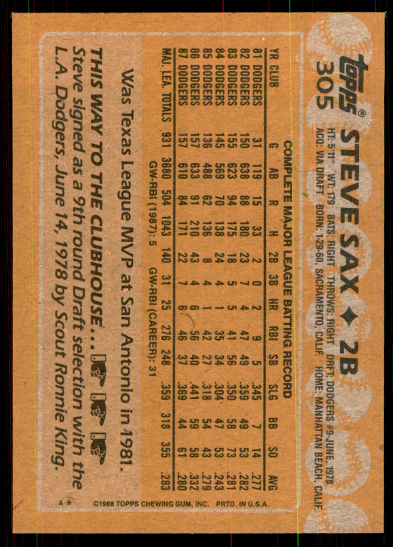 | Description: | Steve Sax | | Category: | Baseball | | Year: | 1988 | | Product: | Topps | | Team: | Baseball Cards | | Card Number: | 305 | | Dimensions: | 3½" x 2½" |