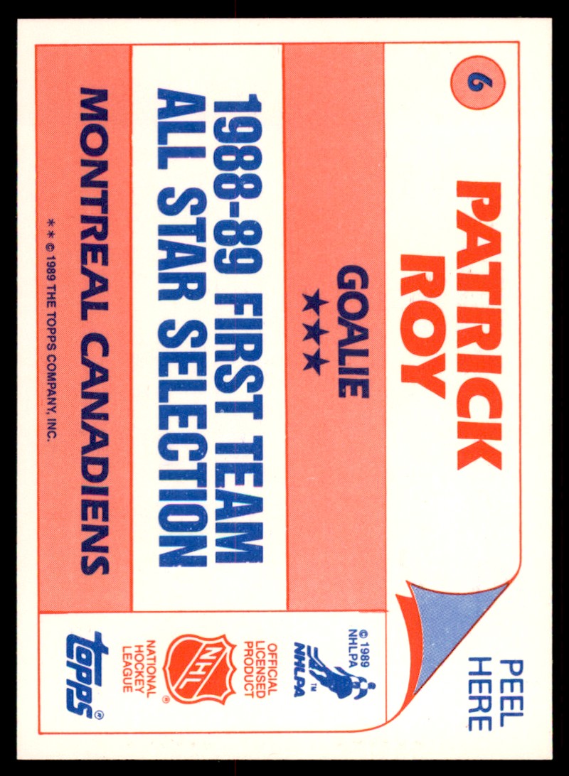 | Description: | Patrick Roy | | Category: | Hockey | | Year: | 1989 | | Product: | Topps | | Team: | Hockey Cards | | Card Number: | 6 | | Dimensions: | 3½" x 2½" |