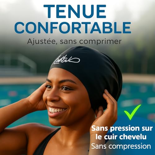 FORME AMPLE – création originale. Le bonnet NE SERT PAS PLUS QU’UN BANDEAU. Il N’APPUIE PAS sur votre chignon, votre queue de cheval ou VOTRE TÊTE et ne glisse pas. Vous n’aurez plus de MAUX DE TÊTE. Ce bonnet se positionne facilement sur la tête comme un bonnet de bain Lahtak et se porte FACILEMENT.