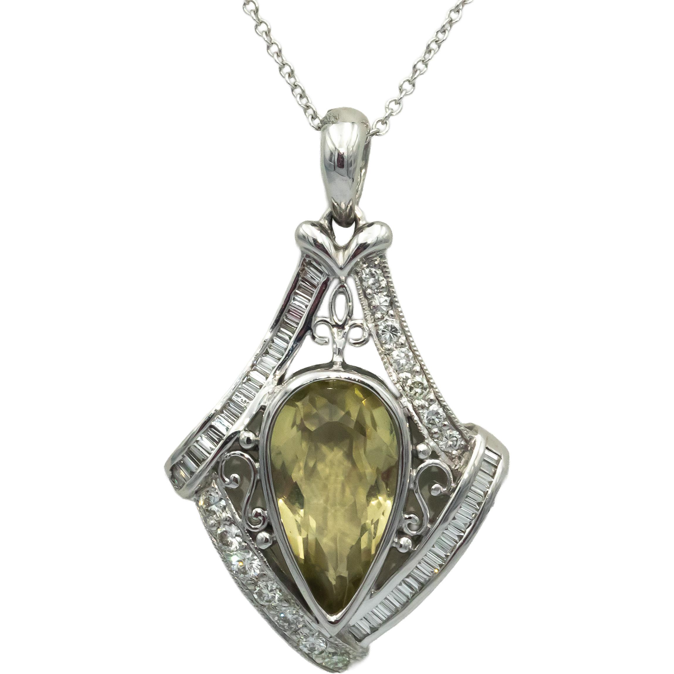 Crafted in 18k white gold, the pendant showcases a pear-cut citrine with a carat weight of 15.0, exuding a warm glow.