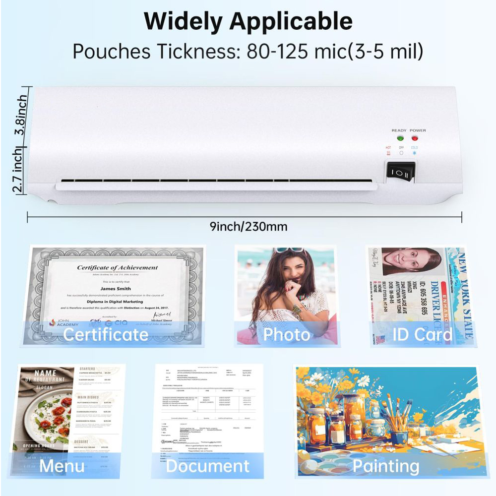 - Compact Thermal Laminator: Buyounger newly launched A4 laminator machine features very compact design and includes 10 laminating pouches(A4*3, A5*3, A6*4). It can laminate up to 9 inches wide (230mm /A4 size), meeting your daily laminating use in office, home, school