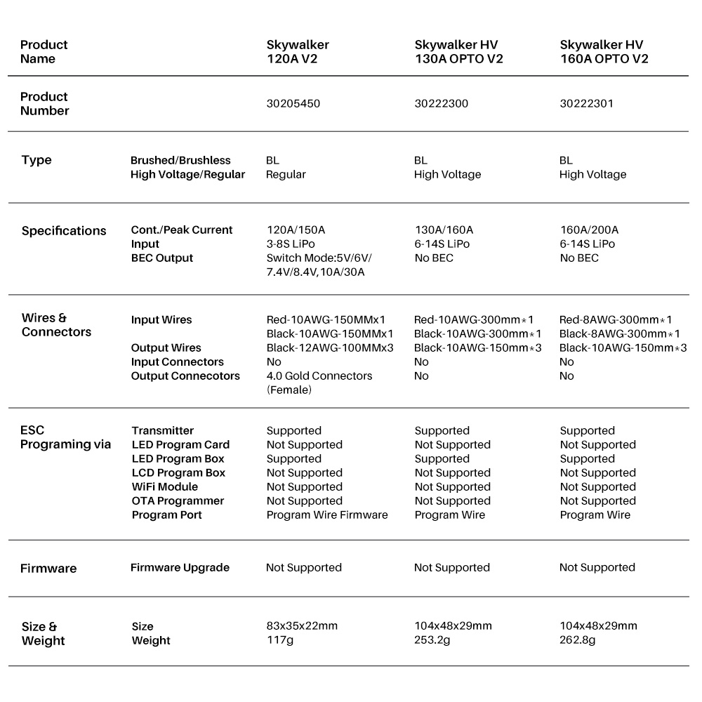 Specifications: Brand:Hobbywing Product name:SKYWALKER V2 Brushless ESC Processor: 32-bit ARM MO Frequency: 120MHz Max speed: 300,000 RPM(2-pole motor)