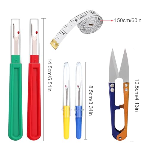 [Ensemble de produits]-2 petits découseurs longueur 9 cm (bleu, jaune), 2 grands découseurs longueur 14 cm (rouge, vert), 1 ciseaux à coudre bicolores, 1 mètre ruban souple et 1 sac de rangement.