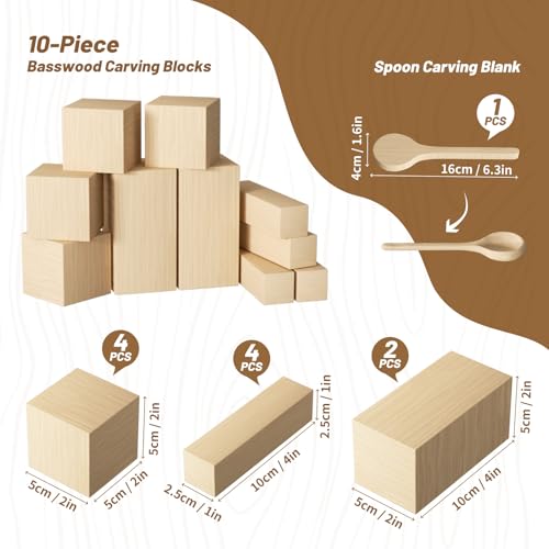 [10+1 blocs de tilleul]: Tilleul naturel à grain fin. Trois tailles différentes. Ébauche de cuillère incluse – idéale pour les débutants !