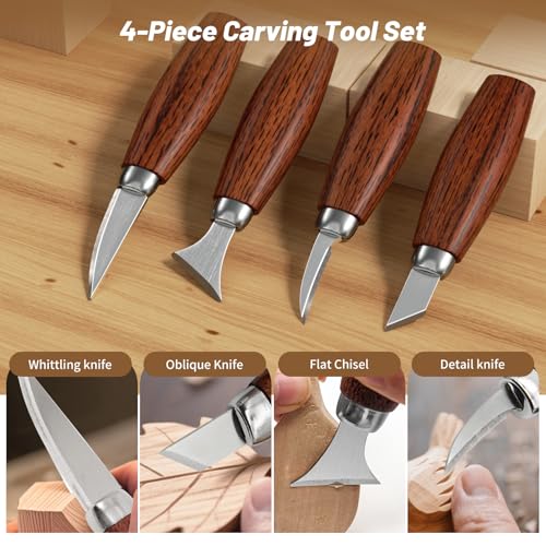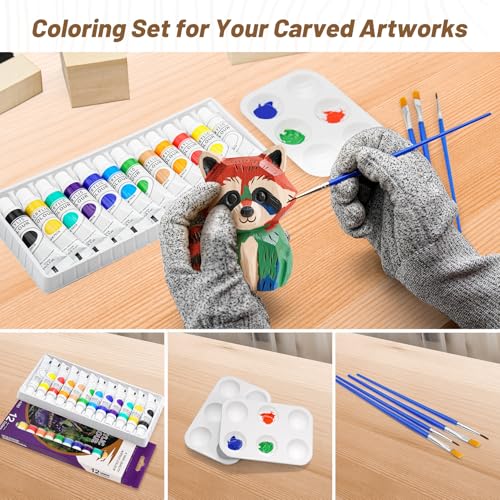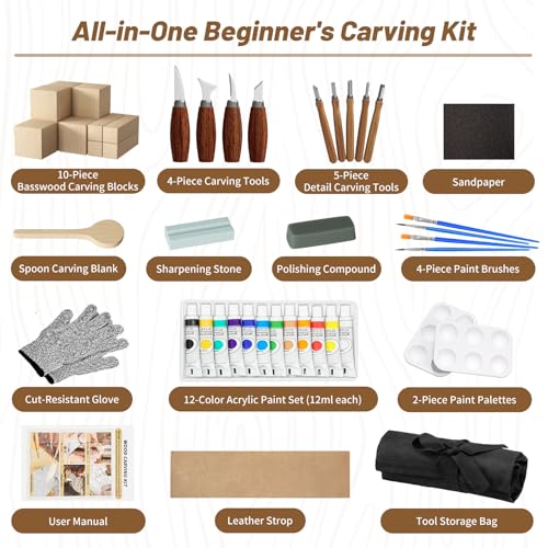 [Kit de sculpture sur bois tout-en-un]: Comprend 4 outils de sculpture, 5 outils de détail, sac de rangement pour outils, 10 blocs de tilleul, ébauche de cuillère, lanière en cuir, pâte à polir, pierre à aiguiser, gant de protection, 4 pinceaux, 2 palettes, 12 peintures acryliques (12ml chacune), papier de verre, manuel d’utilisation.